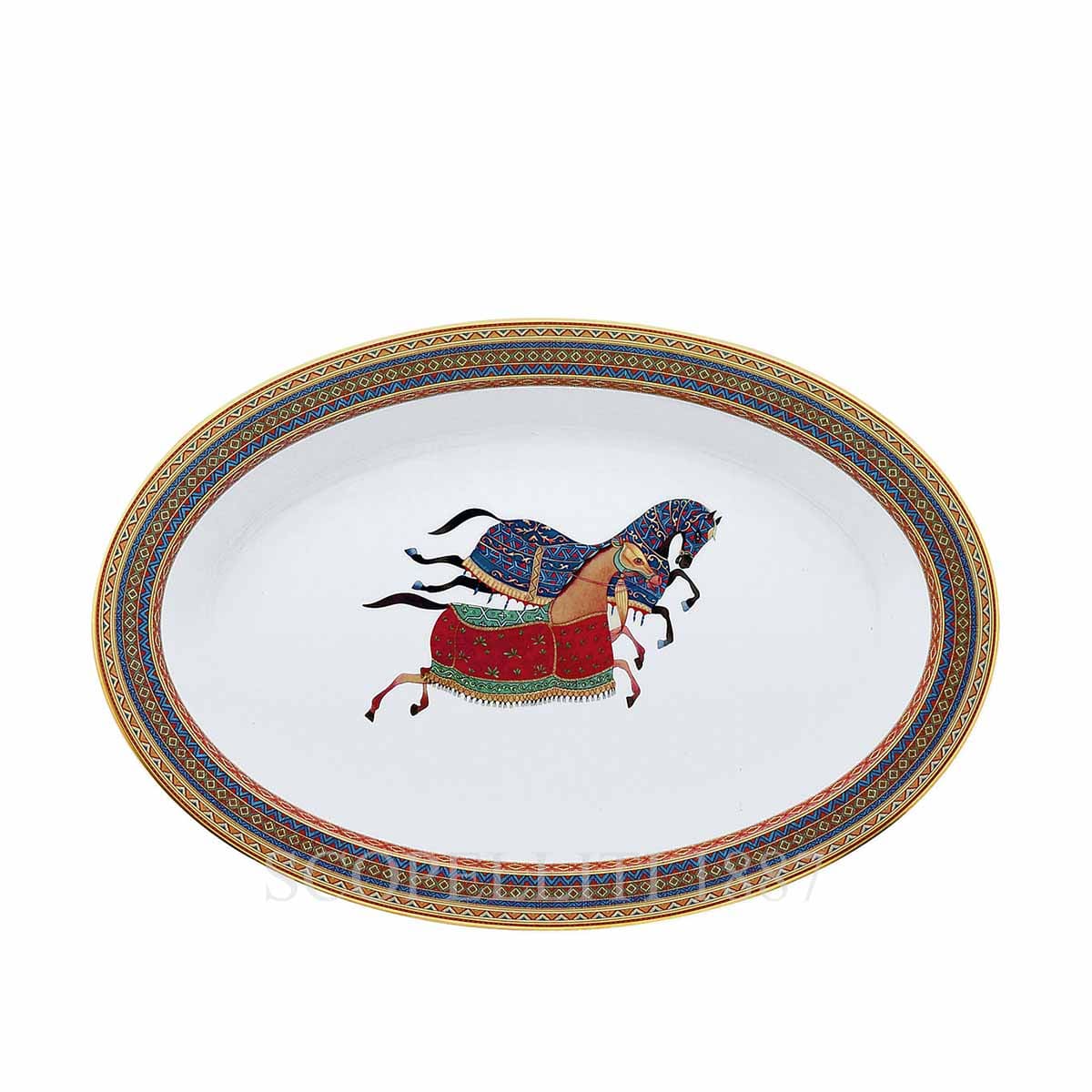 The Hermes Vegetable Dish Cheval d’Orient is an oval-shaped plate made of porcelain with a detailed screen-printed decoration applied by hand. In the center, there are two running horses. One horse is dark blue, while the other is red with a golden saddle or cloth on its back. The horses are depicted in a stylized, artistic manner, as if in motion, with raised legs and flowing tails. The plate has a wide border around its edge, adorned with a series of colorful patterns, including gold, blue, and red, giving it a luxurious and elegant appearance.