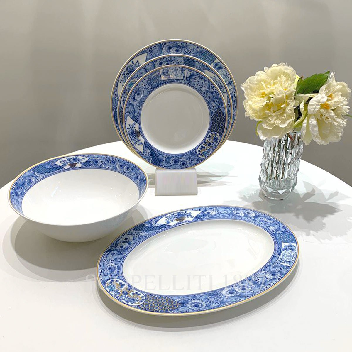 Kabuki porcelian tableware collection takes its name from a a classical form of Japanese theatre that mixes traditional dance with dramatic performance. Beautifully observed and subtly varied studies of the harebell, with its slender stems and graceful flowers, create this delicate and sensitive design in fine bone china. This is a particularly elegant piece of porcelain, which Hutschenreuther only had in its range for a short time. Blue ornaments adorn the dishes. The clear design underlines the grace of this series.