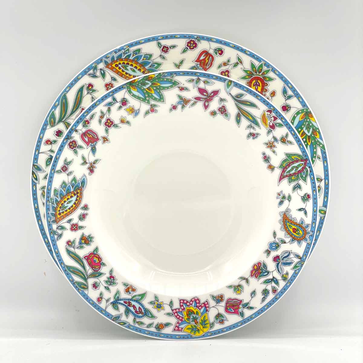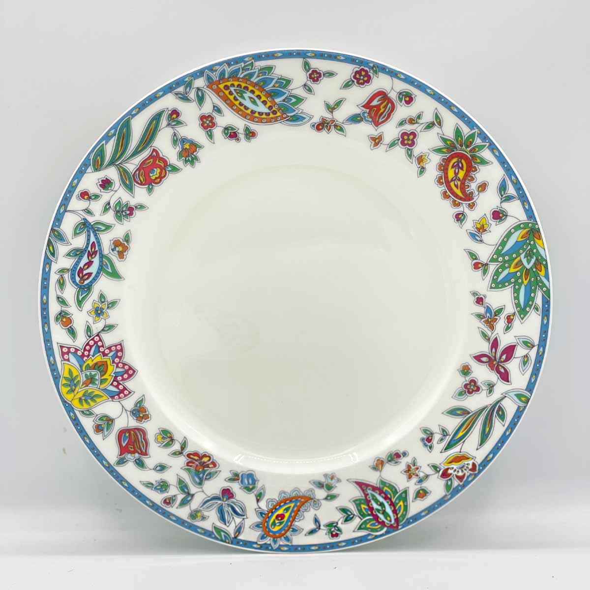 The Hutschenreuter Dinnerware Fiesta is a full dinner service crafted from sleek, glossy white porcelain. Adorned with a vibrant multicoloured frame, intricate detailing, and a fine gold edge, the blue accents bring a lively, cheerful touch to your table. The design exudes a sophisticated, vintage charm, making it perfect for both formal dining occasions and as a collectible piece.