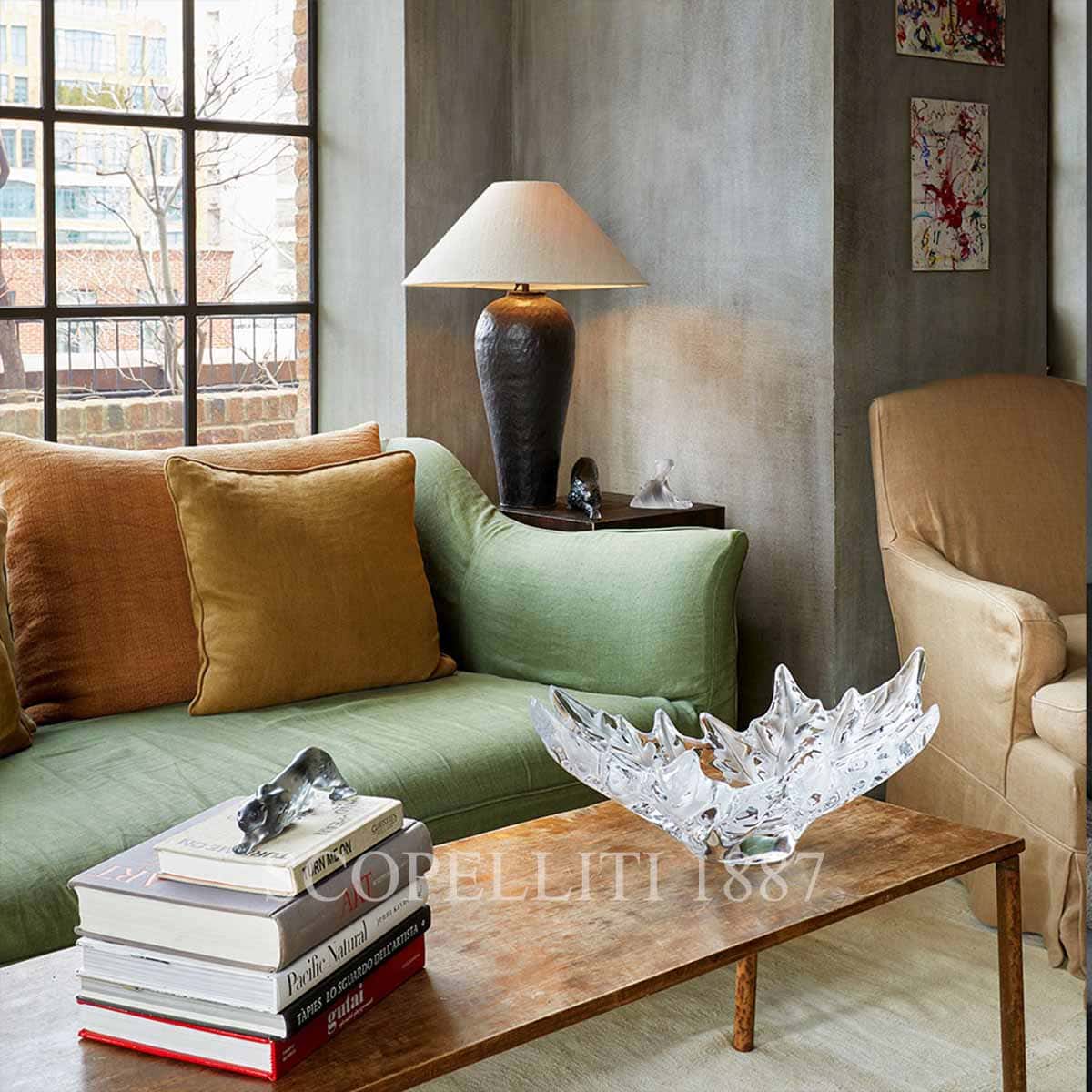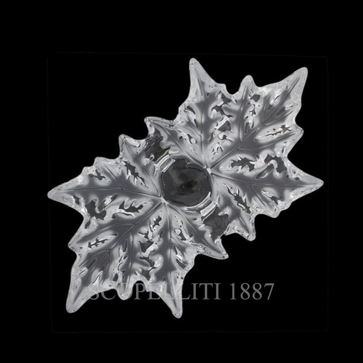 The Lalique Champs-Élysées bowl is a beautiful piece of art designed by Marc Lalique in 1951. It is inspired by the plane trees that line the famous Champs-Élysées street in Paris. The vase shows finely detailed leaves that are carefully sculpted in crystal. The satin finish makes the leaves look soft and elegant. This iconic artwork is now issued in a grand and small version. One of the grand versions is transformed by the manufacturing technique of double gathering.