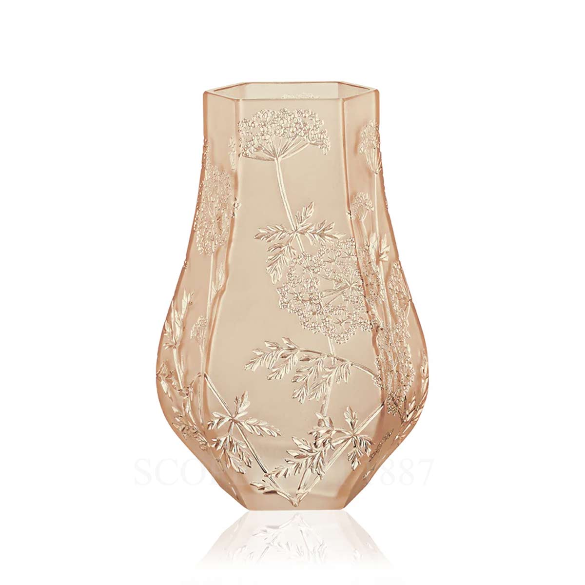 A poetic expression of movement, the Lalique Ombelles Vase Gold features a delicate pattern of slender umbel flowers gently swaying in the breeze. The design plays with volume and light, where satin-finished crystal contrasts with polished details, offering a harmonious interplay of texture and radiance. Enriched with a precious gold luster, this vase elevates the natural motif into a statement of luxurious artistry. Its sleek silhouette and intricate modeling make it a sculptural centerpiece—equally suited to refined contemporary spaces and classic interiors. Standing at 29 cm (11.42 in) tall, with a width of 19.2 cm (7.56 in) and length of 14 cm (5.51 in), and weighing 3.1 kg (6.83 lbs), it is a remarkable creation of French savoir-faire.