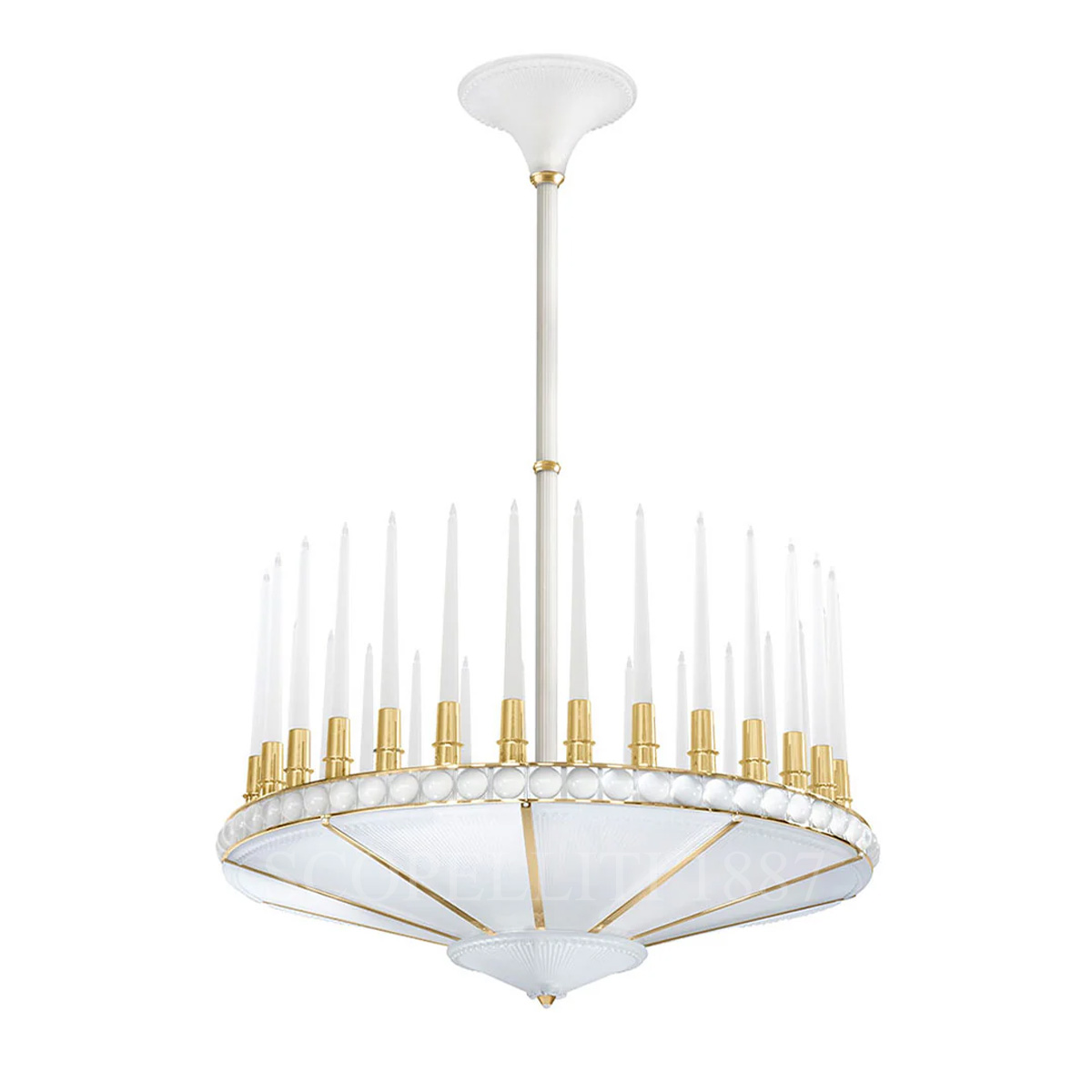 A Gilded Masterpiece of Light and Legacy The Lalique Perles Gilded Chandelier captures the timeless beauty of René Lalique’s original 1930s designs, reimagined by Pierre-Yves Rochon in a majestic satin-gold finish. Inspired by the symbolic elegance of candlelight, this masterpiece is a harmonious union of neoclassical flair and modern lighting innovation. Slender crystal candles rise in a graceful rhythm from a crown of satin-finished cabochons and stripes, diffusing a soft, golden glow through the highest quality crystal. Enhanced by advanced LED technology and remote-controlled dimming, this chandelier blends tradition with convenience. A tribute to Lalique’s commitment to excellence, the Perles Gilded Chandelier transforms any room into a stage of refined French luxury.