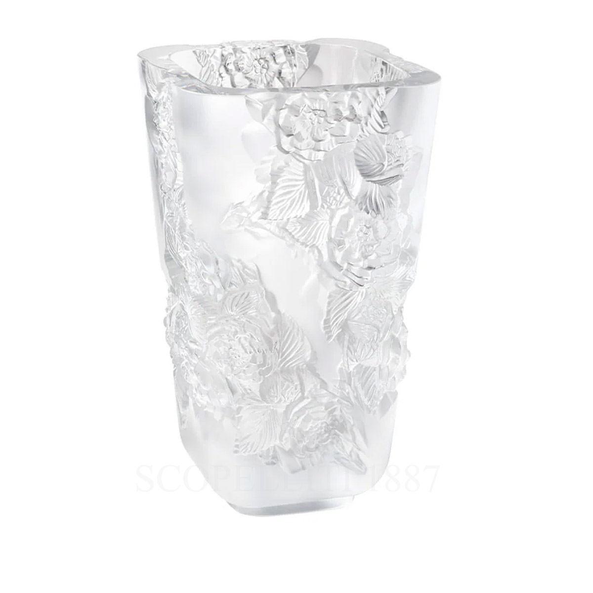 The Lalique Pivoines Vase Large in clear crystal is a masterful composition of contrasts: architectural form meets floral exuberance. Inspired by the peony—a flower that symbolizes prosperity, honor, and feminine beauty—the design captures a harmonious balance between mineral strength and romantic delicacy. The sculpted garlands of blooming peonies seem to emerge organically from the rigid square silhouette of the vase, reminiscent of nature reclaiming forgotten stone ruins. This juxtaposition of geometry and botanical flow makes the Lalique Pivoines Vase Large a striking centerpiece in any refined interior. Hand-carved with intricate detailing, the crystal flowers evoke the technique of Lost Wax sculpture, where the artisan destroys the mold to reveal a hidden masterpiece. Every curve and petal is a tribute to Lalique’s legendary craftsmanship and deep artistic heritage. Measuring 27.5 cm (10.8 in) in height and 23.4 cm (9.2 in) in width, with a commanding weight of 9.1 kg (20.06 lbs), this large crystal vase stands as a monumental and luminous work of art. Handcrafted in France, the Lalique Pivoines Vase Large transforms the symbolic beauty of the peony into timeless crystal—capturing a story of nature, resilience, and elegance.