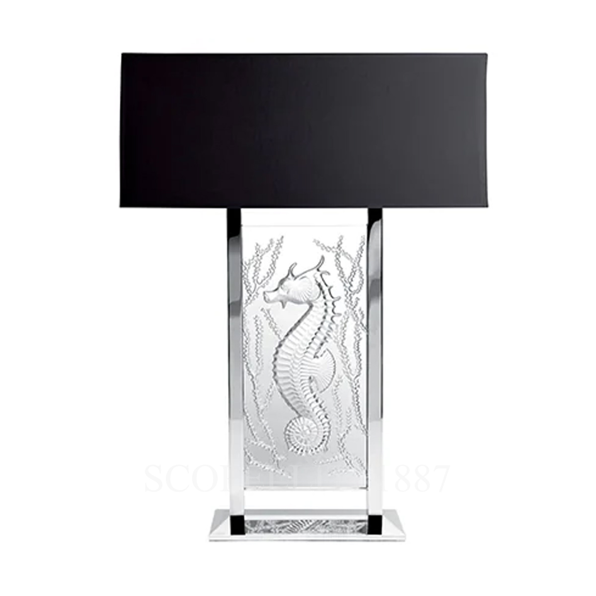 The Lalique Poseidon Lamp brings a contemporary interpretation of the natural world into interior design. Evoking a journey from the countryside to the ocean depths, this design features a vertical veil of clear crystal, delicately sculpted to resemble underwater currents. This luminous sculpture is framed in chrome-plated aluminum, enhancing its sleek and modern silhouette. The lamp captures Lalique’s signature artistry, blending nature and innovation in a refined decorative object. Crafted entirely in France, the Poseidon Lamp emits a soft, warm glow ideal for serene living spaces. A unique piece that stands as both a functional light source and a collectible work of art.