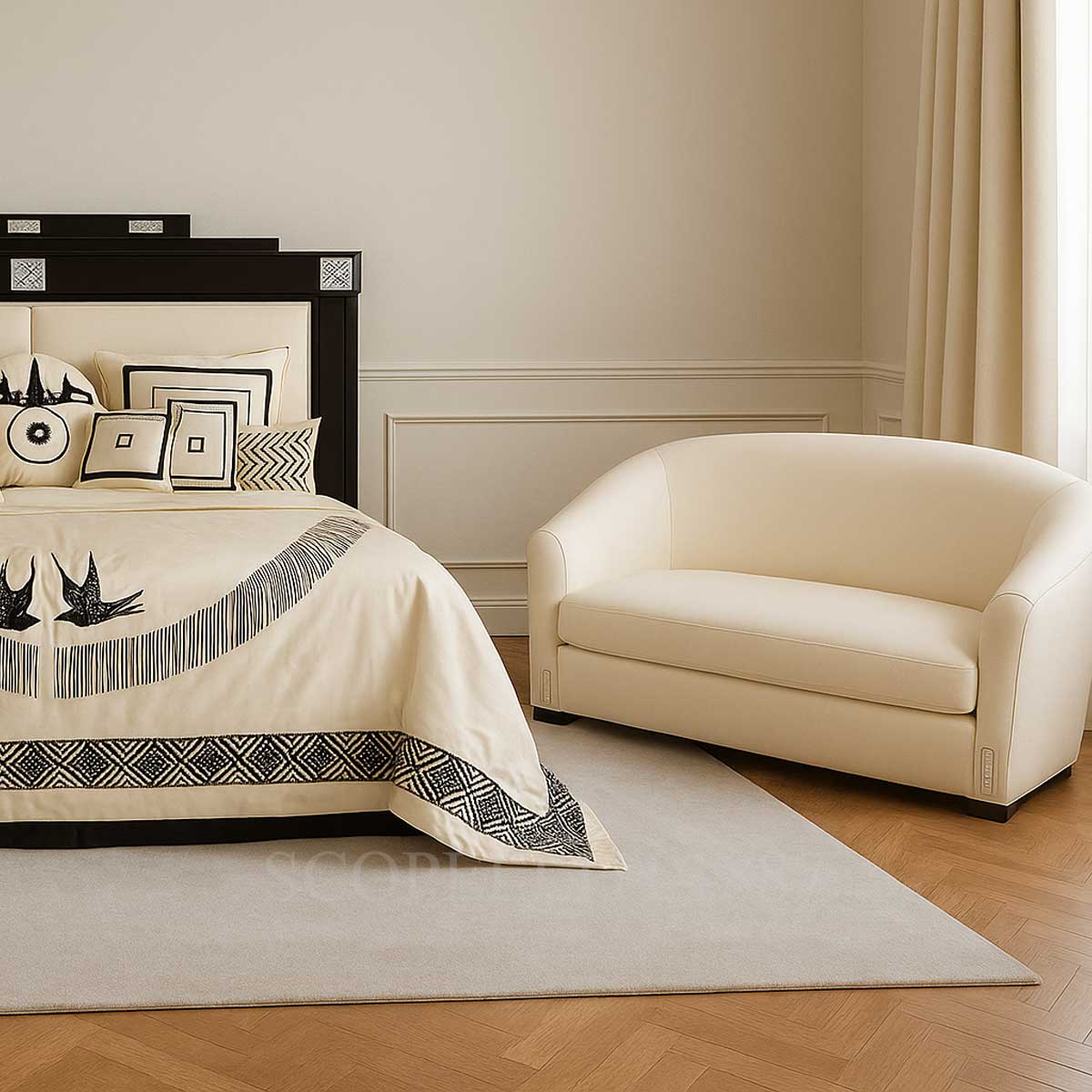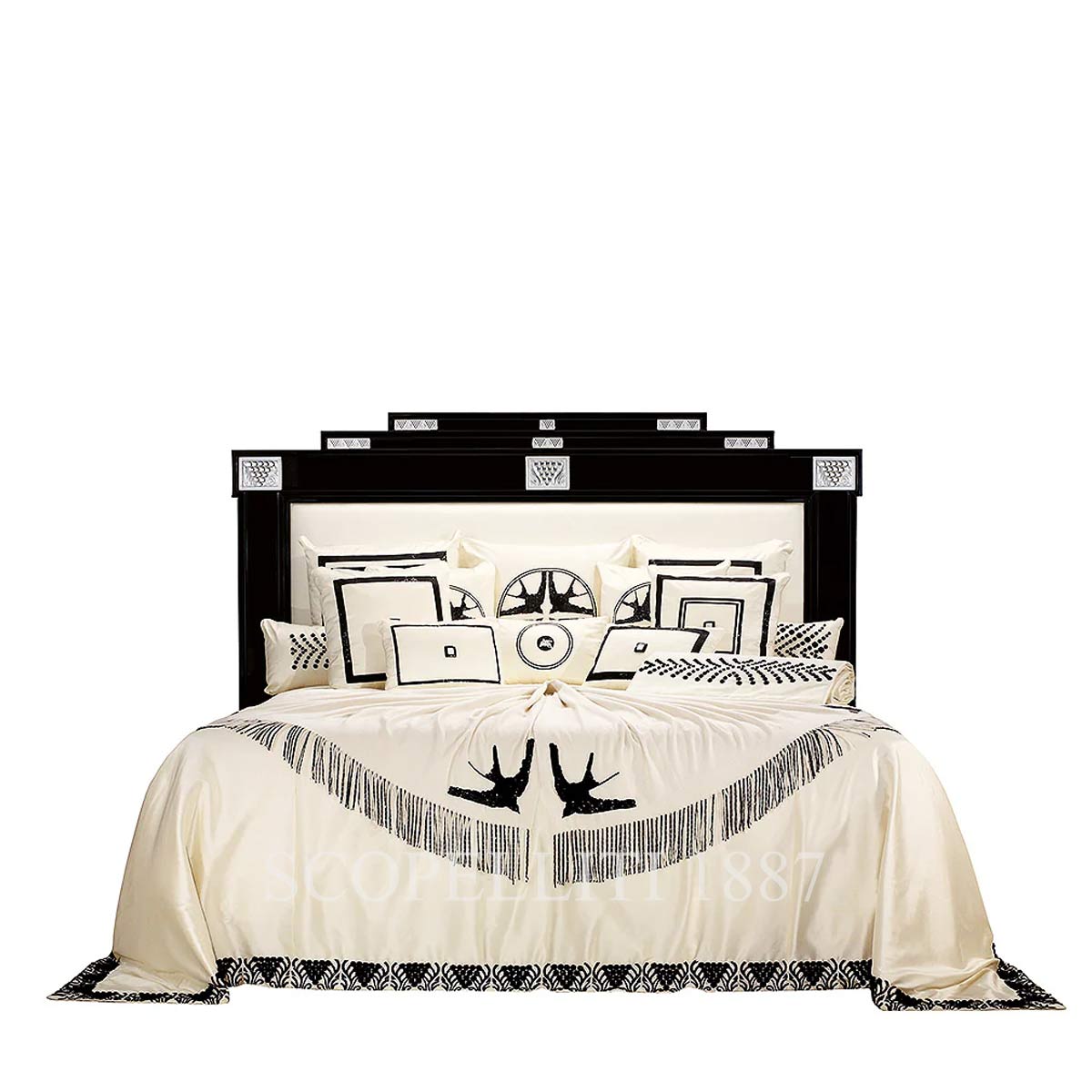 The Lalique Raisins Bed is a tribute to the pleasures of life, inspired by the Raisins motif that recalls Bacchus—the Roman god of wine, vegetation, and celebration. With panels of clear crystal sculpted in delicate vine and grape patterns, this majestic bed embodies the essence of French decorative art and hedonistic refinement. Framed in black lacquered wood, it brings dramatic elegance and artisanal excellence into the most intimate of spaces. Designed by Lady Tina Green and Pietro Mingarelli for Lalique Maison, this numbered edition is a statement of timeless luxury.