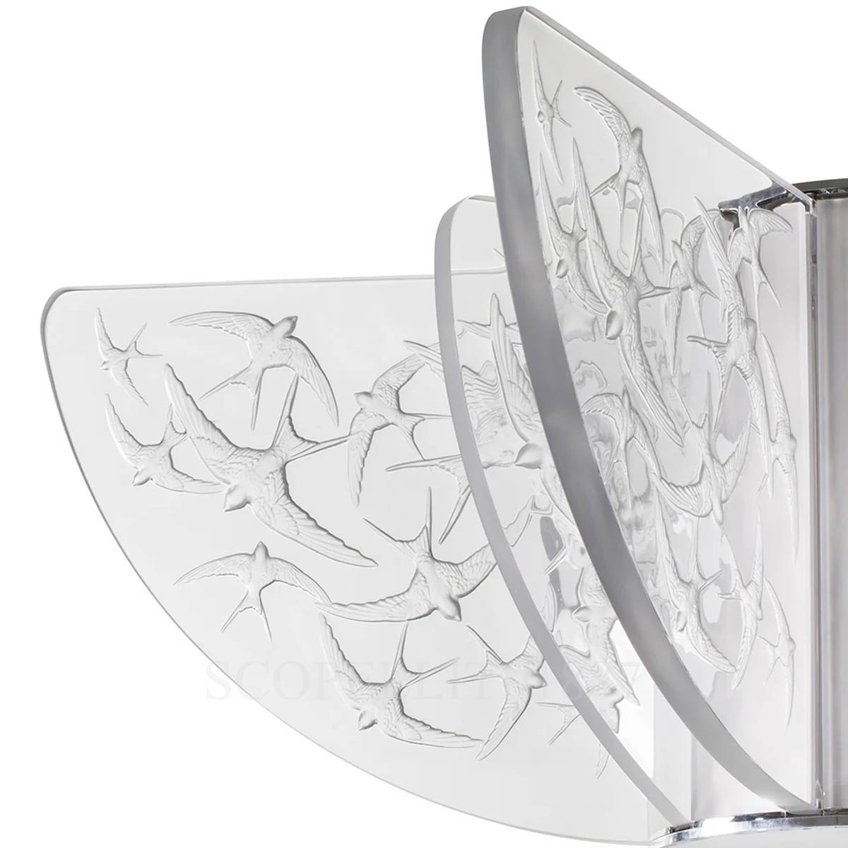 An Aerial Ballet in Crystal The Lalique Swallows Small Chandelier pays homage to René Lalique’s fascination with the natural world—especially the graceful movement of swallows in flight. Drawing inspiration from his original creations, this chandelier features delicately sculpted birds in clear crystal, with finely chiselled wings capturing the poetry of motion. Suspended in silvered elegance, the piece brings a serene and timeless ambiance to any refined interior.