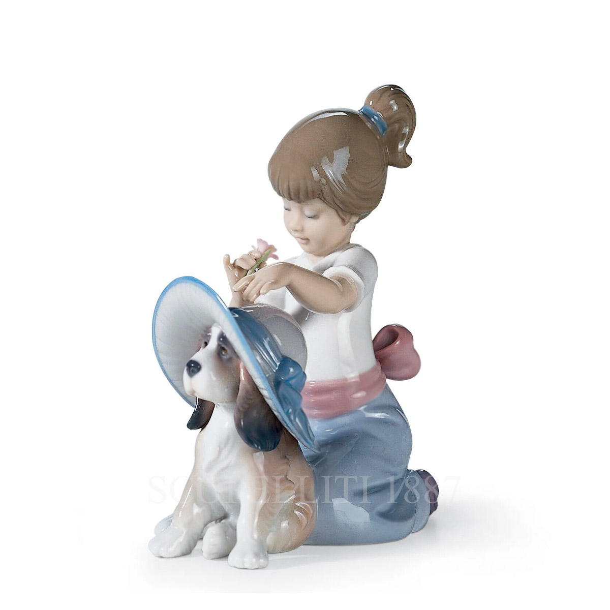 The puppy puts up with his mistress’ games with resignation. Anything to see her happy! A heart-warming and amusing scene, made in glossy porcelain and decorated in soft pastel colours. Ideal as a gift, a collector’s item or decoration.