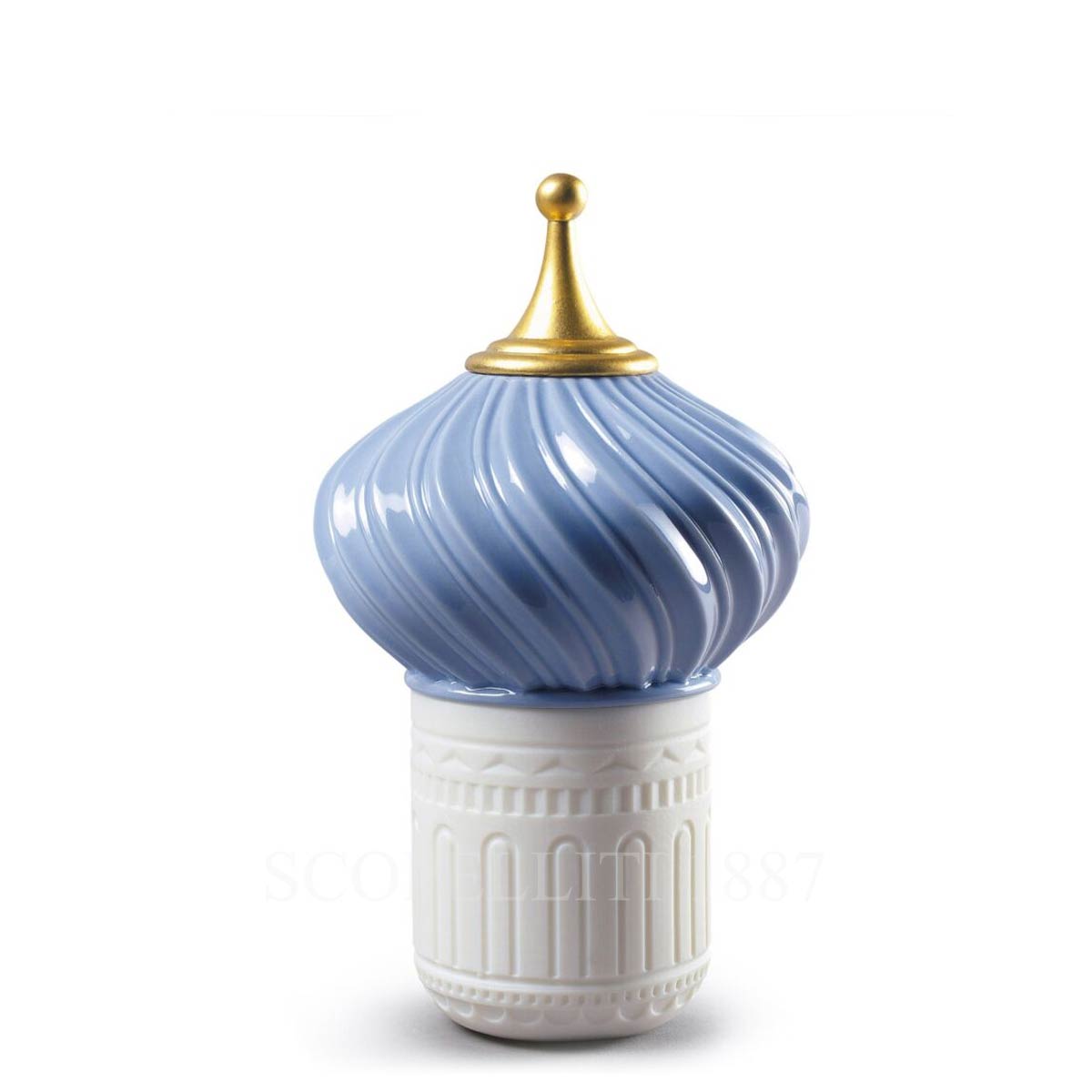 Scented candle designed in the shape of a tower, with a translucent porcelain container and blue and gold lustre cover.  Its scent carries such special ingredients such as cassis, lotus flower and frankincense.