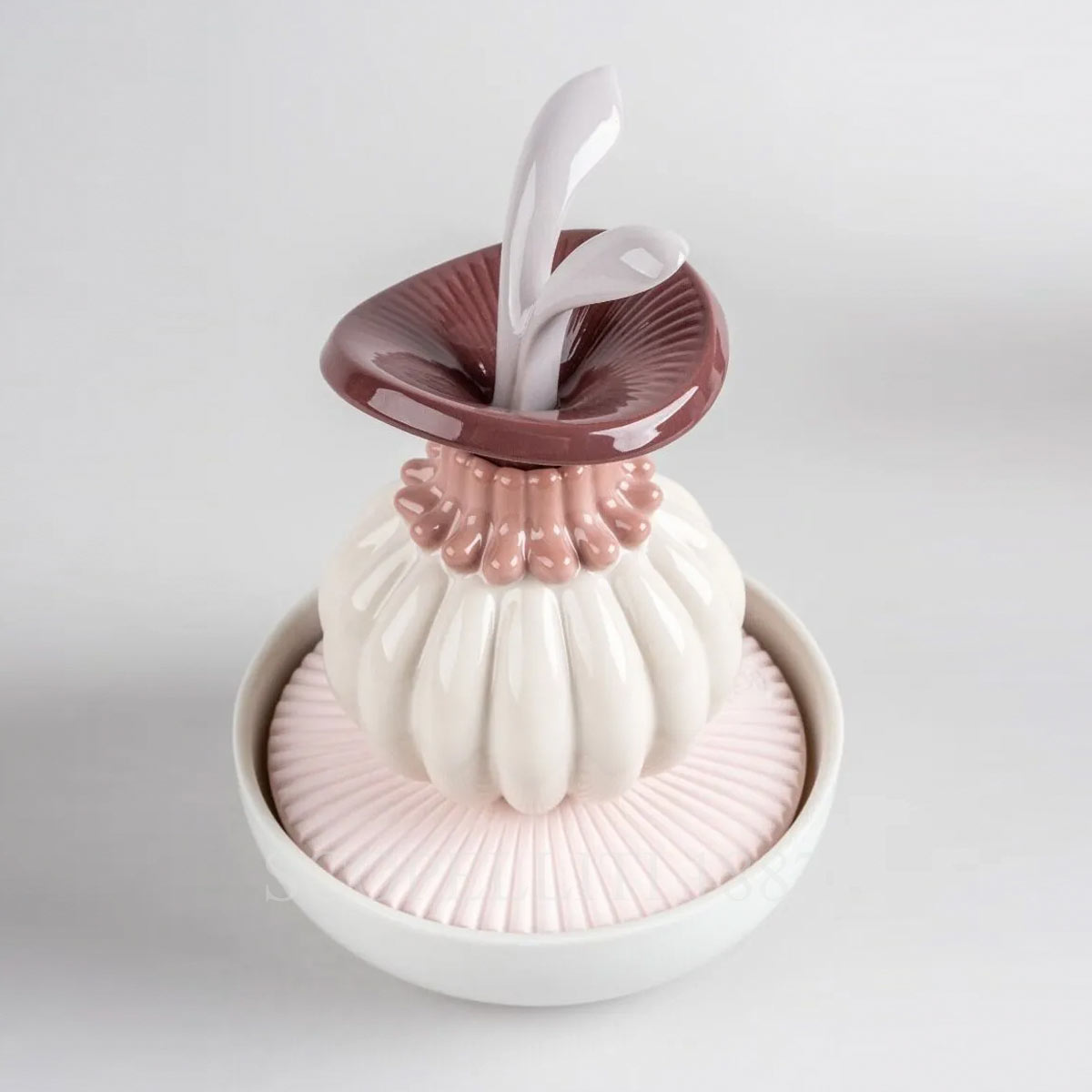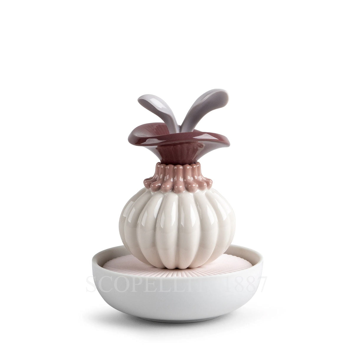 The plant world is an inexhaustible source of inspiration for Lladró artists. From its innumerable organic shapes and its infinite shades of color, the designs of these imaginary flowers are born, which act as diffusers of the most inebriating fragrances. The flower of the diffuser is made of glossy porcelain while a porous opaque porcelain is used for the base. A special formulation that allows the aroma poured on the base to spread in the environment in a natural way. This diffuser comes with the Gardens of Valencia fragrance. A fresh aroma in which the notes of bergamot, tuberose, sandalwood and musk stand out, which immediately takes us back to summer evenings spent in the moonlight.