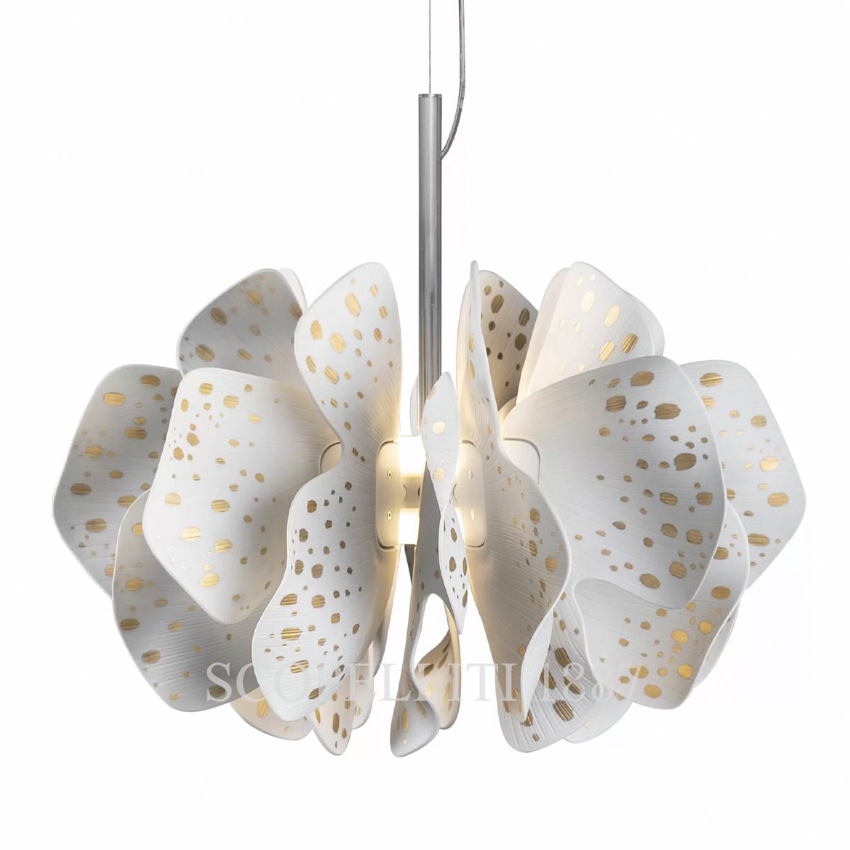 Lladró Nightbloom Hanging Lamp White and Gold in porcelain. Delicate petals that seem to sway in the breeze inspire unique and innovative pieces.