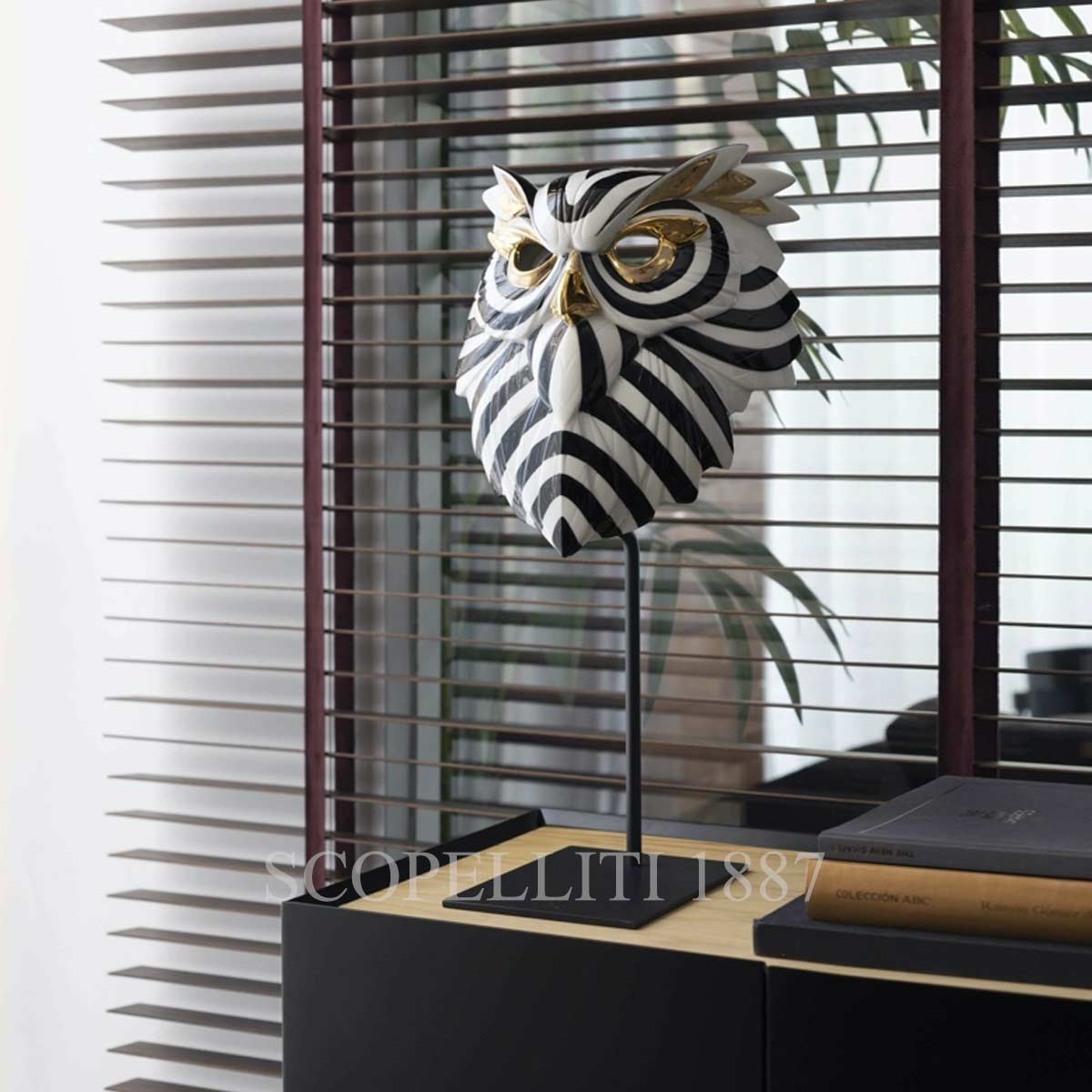 An absolutely innovative collection of animal masks in the Lladró catalogue. The wall decoration is expanded with this set of contemporary design inspired by traditional African masks. With a sculptural treatment between the realistic and the conceptual, these masks can also be displayed on a table thanks to a specially designed support. Lladrò Owl Mask is a piece of glazed porcelain, decorated with a bold design of black lines on a white background and details of golden luster. The owl mask is loaded with symbolism and expressive force and is perfect to give or decorate all kinds of environments. Gloss porcelain, decorated in white, black & golden luster.