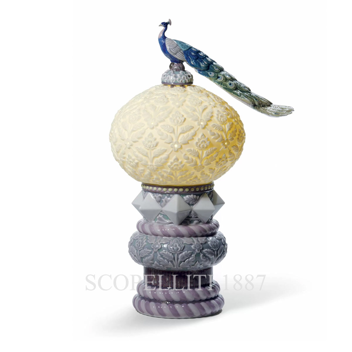 Lladró Peacock Table Lamp with handmade design based on the peacock figurine. Designed and handmade in Spain.