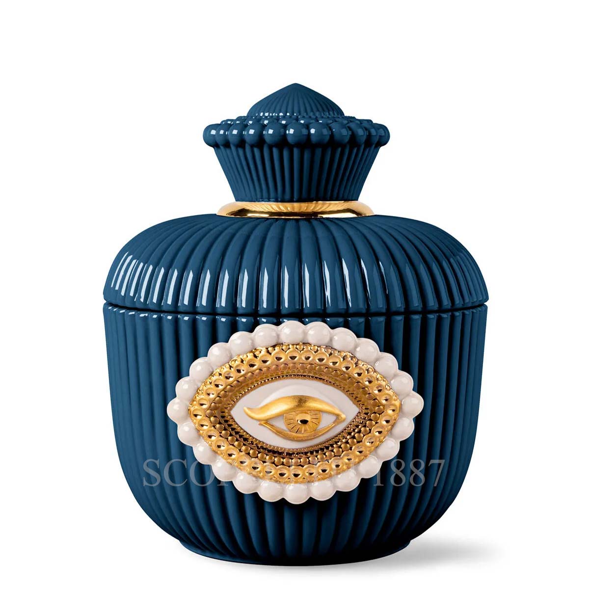 In 1785, when Maria Anne Fitzherbert opened a love letter from her admirer, Prince George of Wales, she wasn’t expecting to find an eye gazing intently back at her. The prince had fallen in love with Fitzherbert, but their courtship had been disastrous. Royal laws forbade a Catholic widow like his beloved from becoming a monarch. But the prince was determined to marry her and he wrote her a letter containing a rare, spellbinding gift, a miniature painting of George’s own right eye. Eye miniatures, also known as lover’s eyes, cropped up across Britain and were in vogue for around half a century. As with the royal couple, most were commissioned as gifts expressing devotion between loved ones. All were intimate and exceedingly precious, meant to be tucked into pockets, or pinned close to the heart. The Lover’s Eyes collection is inspired by this fascinating tradition, bringing into the 21st century a series of functional objects that seem to look back at us. In this case, a jewelry box featuring an eye etched in vivid detail on the porcelain. It is decorated in a combination of intense Saxony blue and golden luster on white porcelain. A creation full of meaning, both functional and hypnotic.