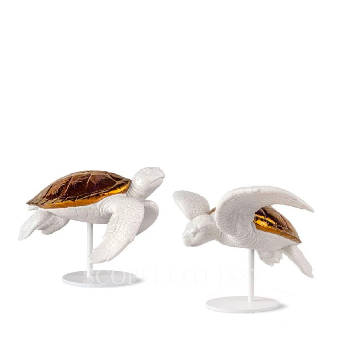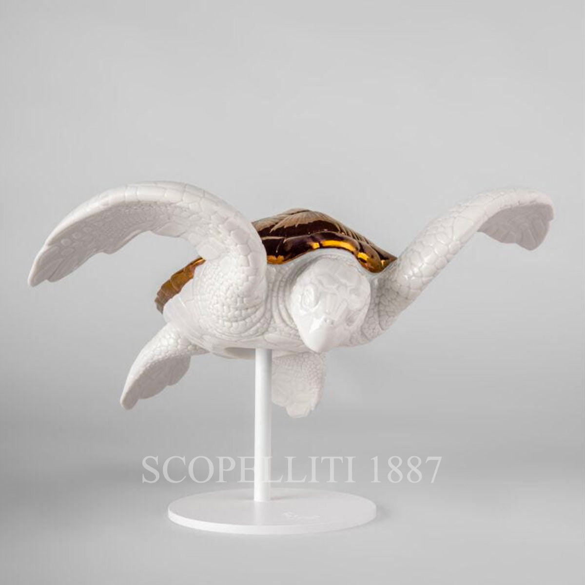 This porcelain creation shows this extraordinary creature, a symbol of longevity, calm and solemn when it walks on the sand and swift and elegant when it dives into the depths. The sea turtle is made of white porcelain. A coppery luster was chosen for the decoration of the carapace which gives life to a refined effect in contrast with the white. It is equipped with a white metal support for the support.