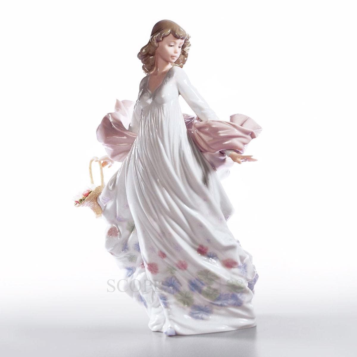 This absolutely beautiful porcelain figure features a stunning young lady with wavy chestnut hair enjoying the breeze which ruffles her flowing white gown and dusty pink shawl. The full gown enriched on the hem by blue, pink and green flowery details wraps round the dainty silhouette revealing the sensual curves of her body while she cherishes her basket of freshly picked spring flowers. The perfect combination of pastel colours and joyful movements create a piece full of charm and life which would look lovely within any home.