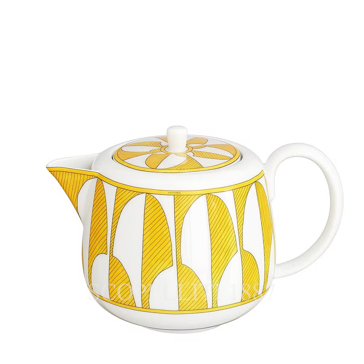 The Hermès Soleil d’Hermès teapot is a radiant centerpiece of French Limoges porcelain craftsmanship, featuring joyful yellow and white graphic motifs designed by Arielle de Brichambaut. Inspired by Mediterranean sunshine, its vibrant design brings color and sophistication to any tea ritual or hot beverage service.