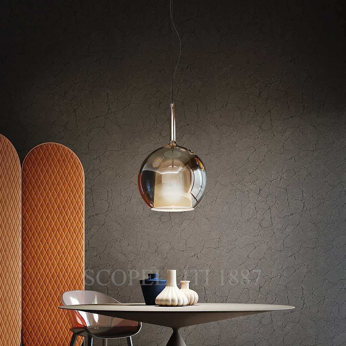 The glass of the Glo Pendant Lamp comes in transparent and colored or reflecting and metallized finishes. An inner conical glass diffuser directs light in one direction while spreading it diffusely throughout the room. In metallized versions, this effect becomes visible when the light is turned on, resulting in versatile illumination and a captivating, almost surreal glow. The harmonious, soft shapes define the contour of the Glo lights, with the glass ball tapering into a slender tip. The suspension cables are discreetly placed at the end of this tip.