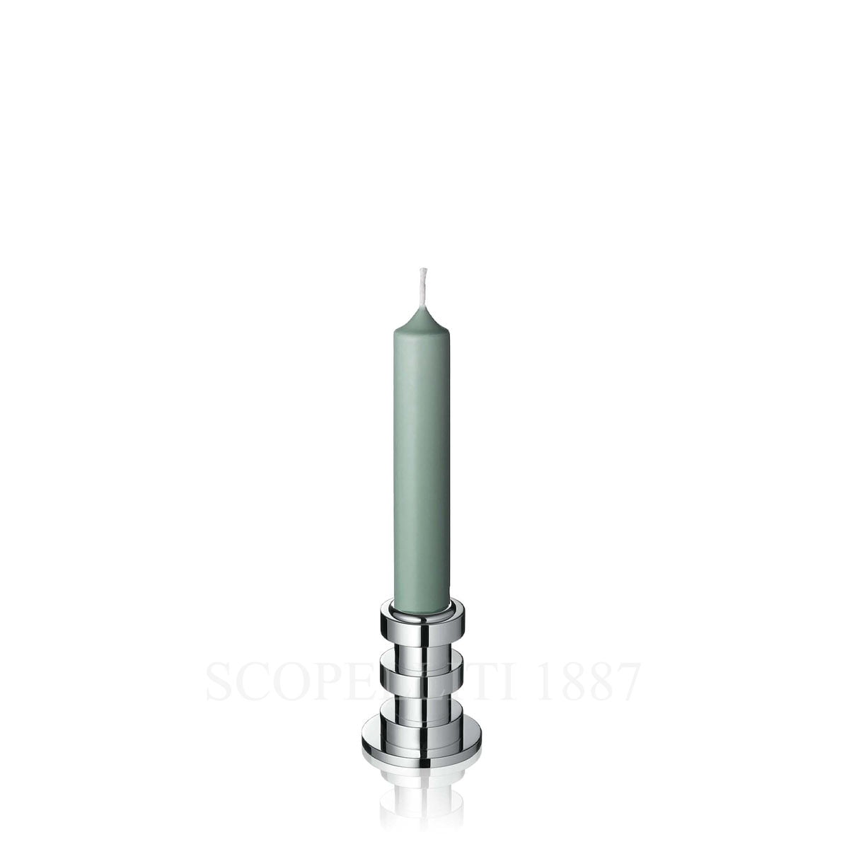 The Ruban collection was born from a design by Jean Puiforcat in the 1930s. A column of perfect silver-plated metal discs provides the structure for a single or double candlestick, a votive candle holder and a three-light candelabra. A set of decorative objects featuring strong lines to delicately brighten the most elegant rooms and offer a refined aura to distinguished tables.