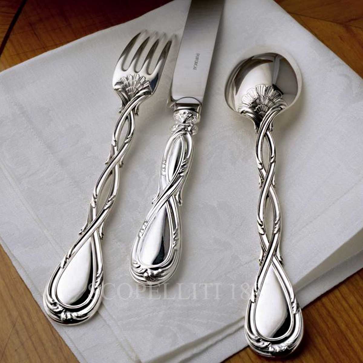 Designed in the 18th century by silversmith Nicolas Cornu, this sterling silver model, amazingly bold for the time, stands out as a masterpiece of silverwork: its naturalistic design blends grace, finesse and refinement with a helix-shaped handle embellished with openwork motifs, so sophisticated that it requires hand filing. Refined to the utmost degree, Royal flatware wears it name well. Puiforcat’s commitment to uphold its traditional role as part of France’s cultural heritage demands the highest level of skill and attention to detail. And that is why each piece of “Royal” is absolutely unique because it has been crafted and polished with the greatest precision.