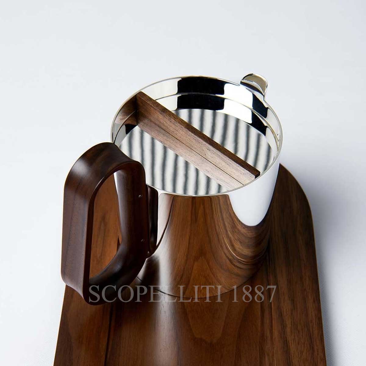 Crafted with pure and fluid lines, the PHI tea pot is meticulously made from silver-plated brass in Puiforcat’s workshops. The finial and handle, crucial elements of its design, are crafted with precision using American walnut. The marriage of silver-plated brilliance and the warmth of American walnut creates a visually stunning and harmonious piece that stands as a testament to Puiforcat’s commitment to excellence.