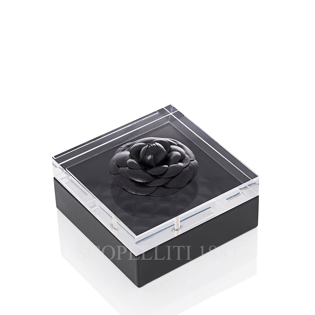 Luxury black leather box with quilted padded lining, acrylic lid with leather flower. Nappa leather, lid of acrylic glass and leather flower, completely handmade in Italy. Size: 15 cm x 15 cm x h.6,5 cm Vanity Flower boxes are made of Nappa leather and have an acrylic lid, which has been refined with a flower made of hand-sewn leather. They are completely handcrafted by the Italian manufacturer Riviere. The inside of each box is lined with Nappa leather, and on the base it is quilted and padded. The only exception is the taupe-coloured box. This box is lined with quilted and padded suede. The base of all the boxes is protected with a hard-wearing satin material. The lid, made of high-quality, hand-cut and polished acrylic glass is also elegantly eye-catching. The acrylic glass that Riviere uses has a wonderful gloss and yet is also very transparent. The hand-sewn leather flower on the lid is particularly attractive. This is colour-coordinated with the main colour.