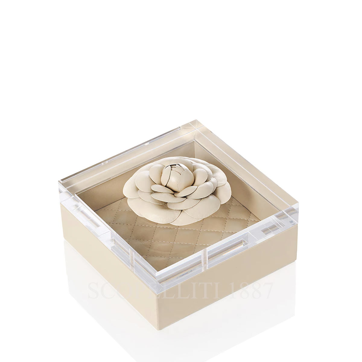 Luxury ivory leather box with quilted padded lining, acrylic lid with leather flower. Nappa leather, lid of acrylic glass and leather flower, completely handmade in Italy. Size: 15 cm x 15 cm x h.6,5 cm These Flower boxes are made of Nappa leather and have an acrylic lid, which has been refined with a flower made of hand-sewn leather. They are completely handcrafted by the Italian manufacturer Riviere. The inside of each box is lined with Nappa leather, and on the base it is quilted and padded. The only exception is the taupe-coloured box. This box is lined with quilted and padded suede. The base of all the boxes is protected with a hard-wearing satin material. The lid, made of high-quality, hand-cut and polished acrylic glass is also elegantly eye-catching. The acrylic glass that Riviere uses has a wonderful gloss and yet is also very transparent. The hand-sewn leather flower on the lid is particularly attractive. This is colour-coordinated with the main colour.