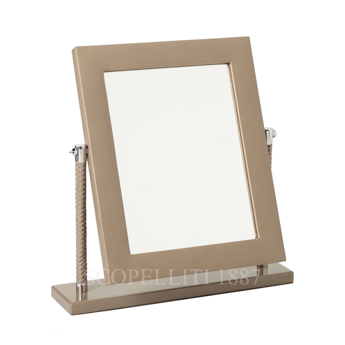 Riviere Vanity leather taupe Mirror with lacquered base and chrome details. Gift box included. Laquered wood, nappa leather, chrome-plated brass, completely handmade in Italy. Please note that these bath accessories from Riviere should be protected from constant humidity. Size: L 34 x W 8 x H 35 cm Designed and manufactured in Milan, and part of the Giobagnara group since 2022, Riviere is a tale of luxury that features all the very best of Italian know-how. Riviere produces sophisticated interior decoration accessories, handcrafted by the best artisans, whose skills have been handed down from generations. THE PRESTIGE OF MATERIALS IN EXCEPTIONALLY REFINED INTERPRETATIONS The appeal of Riviere lies in perfect quality, accurate details, sophisticated lines and an extraordinary combination of refined materials and finishes: superb leathers, hand-polished lacquering, precious wood essences, carved acrylic crystal, gold or silver metal accents, all perfectly matched together to create unique. Exclusive and exquisitely detailed pieces. EACH OBJECT TELLS A STORY OF SKILLFUL PERFECTION The combination of design, quality and unique character with the most innovative solutions of contemporary living, make of the collection an excellence whose style is immediately perceived and recognizable. Riviere products are conceived to cater for a discerning clientele not only looking for the utmost quality but also for a sophisticated style to reflect their elegance, art of living and taste. Made of the finest Italian calf leather and chrome-plated brass, the soap dispenser, toothbrush holder, leather box and boxes are not only necessary utensils, but also optical highlights.