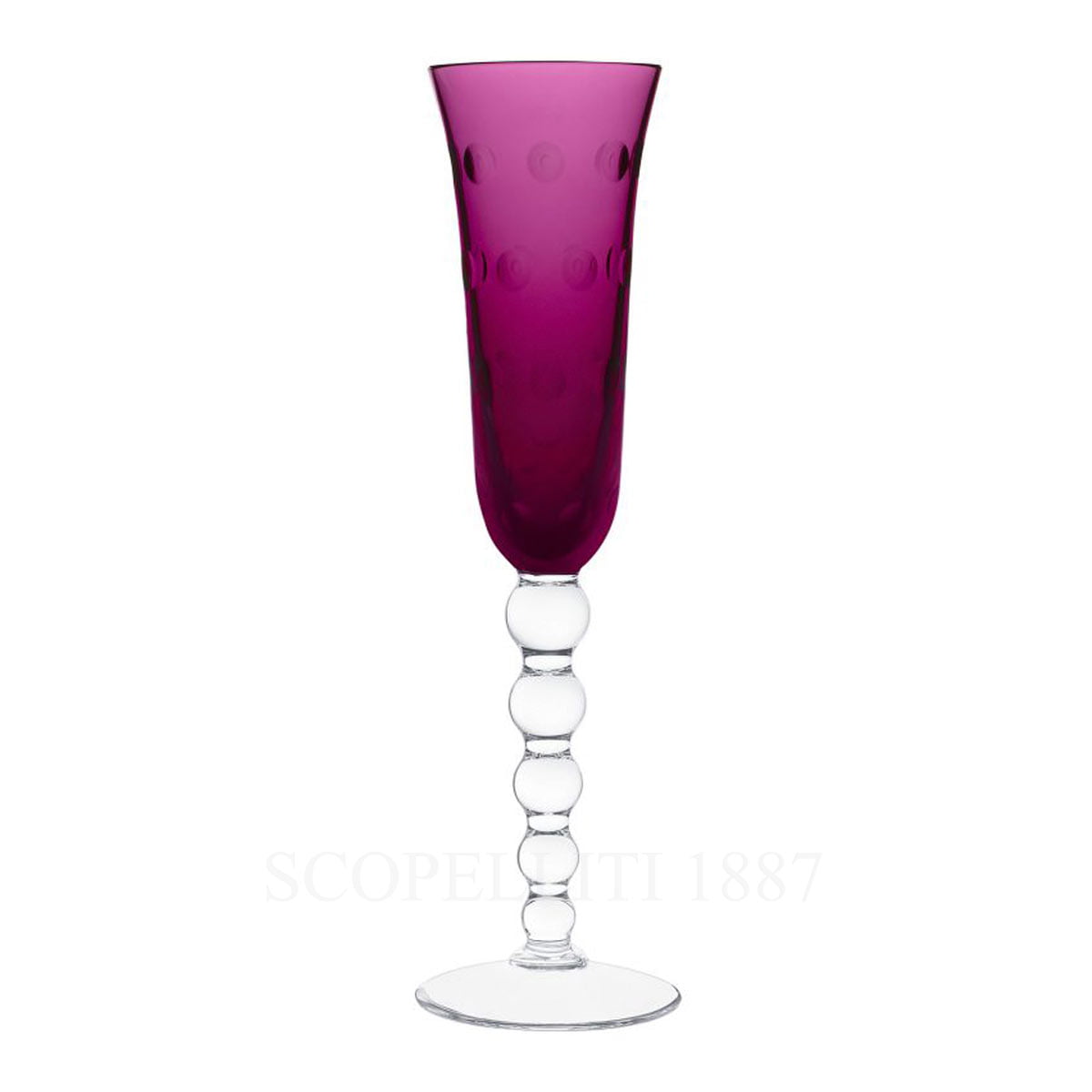 Vibrant and sensual, designed as part of a vast service of shapes and uses, from tableware to bar patterns, Bubbles reinvigorated the art of creation of clear and coloured crystal within Saint-Louis. Sparkling: The “Bubbles” Champagne flutes by Saint-Louis are the right glasses for special occasions. A mischievous stack of crystal marbles on the stem and bubbles, dotting the parison, are the hallmarks of this original service.