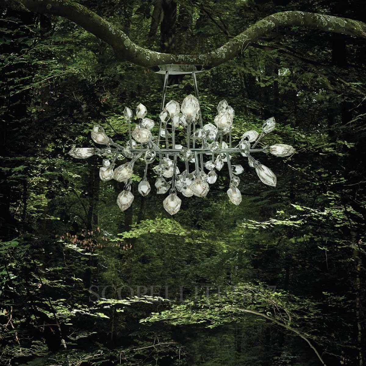 Set in a chrome structure, the crystal buds embrace the horizontally of a ligh-hemmed branch of the 20-light Saint Louis Crystal Excess Chandelier. The crude crystals are reworked with a diamond wheel to achieve a piece of absolute purity.