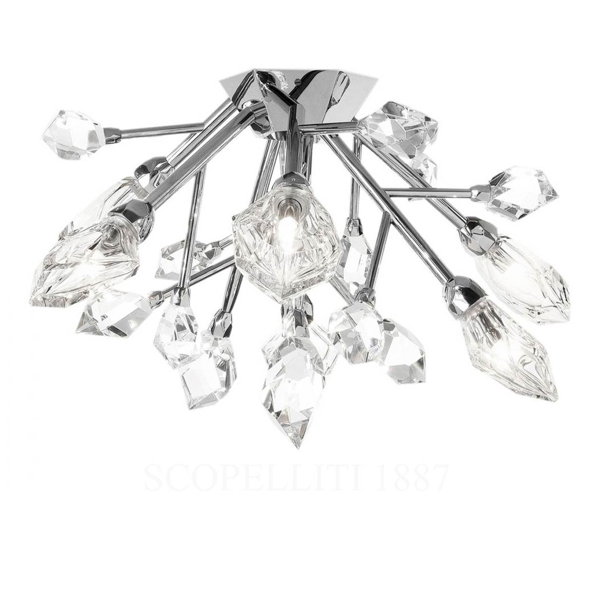 The crystal, refined by the iconic diamond cut, offers a masterly and contemporary reinterpretation of the chandelier. Set in a chrome structure, the crystal buds embrace the horizontal lines of a light-hemmed branch. The raw crystals are carefully reworked with a diamond wheel to achieve absolute purity. In its ceiling version, the chandelier is updated to reflect today’s modern lifestyles.