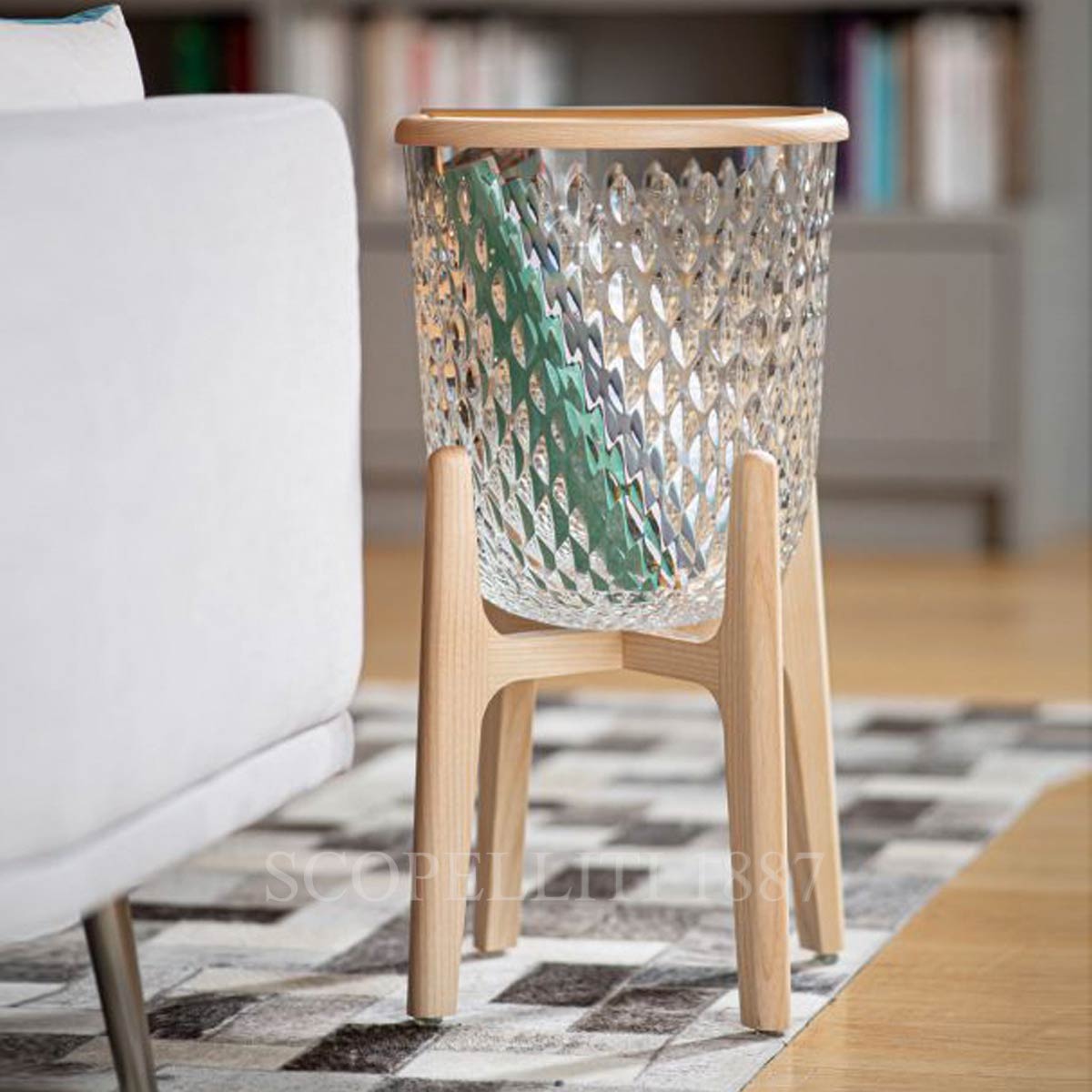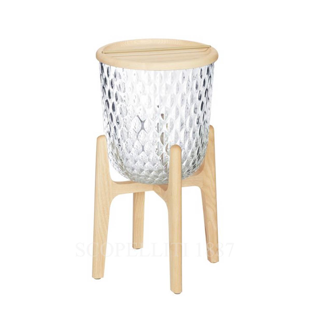 Part of the Folia collection, this side table features a removable wooden top, allowing it to be used alternatively as a footed vase or champagne bucket. Its clear crystal body and naturally varnished ash wood base create a refined harmony of light and material elegance.