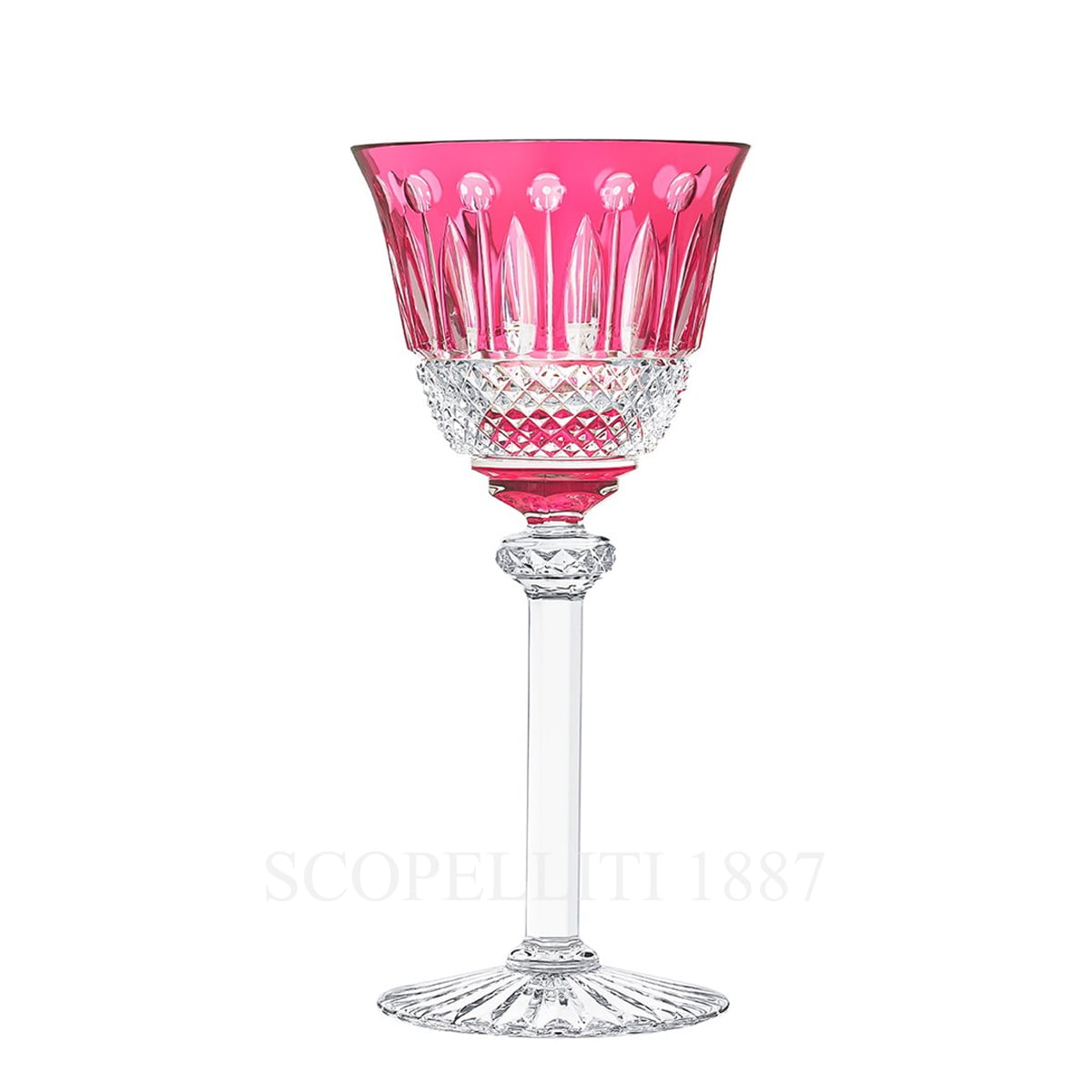 The Saint Louis Tommy Crystal Roemer Red belongs to the historic Tommy collection, famously introduced during a legendary 1928 dinner at the Hall of Mirrors in the Chateau de Versailles. Each glass is crafted over ten days by ten glassblowers and five cutters, showcasing the exceptional skill and tradition of Saint Louis crystal. This red Roemer is perfect for serving wine or water. Its intricate facet, ball, and diamond cuts enhance the brilliance of the colored crystal, making it both a functional and collectible piece of art.