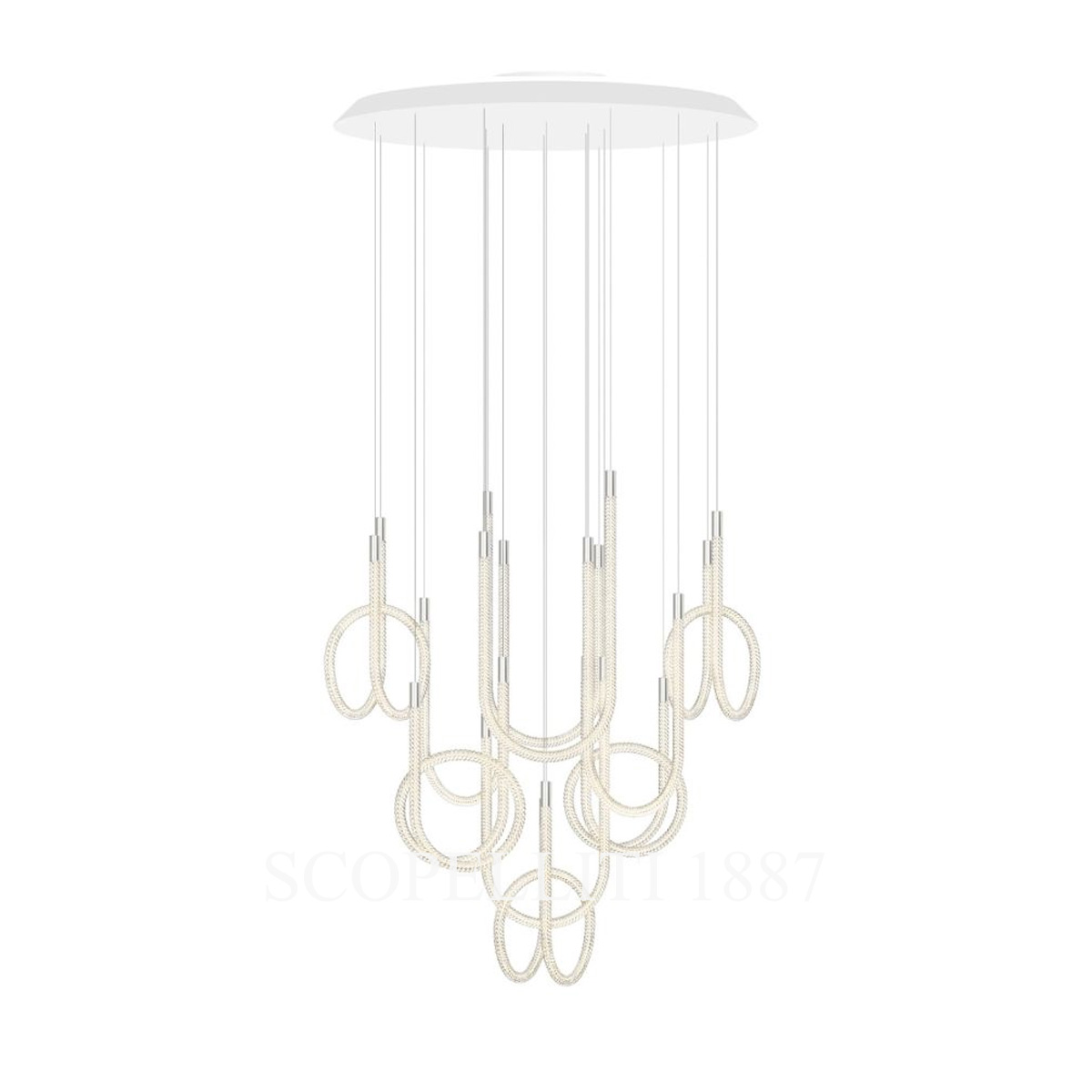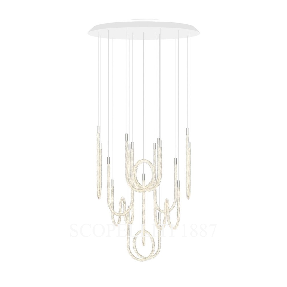 The Saint Louis Torsade 10 Light Pendant Tall is an exquisite lighting fixture that blends contemporary elegance with exceptional craftsmanship. Featuring twisted crystal arms arranged in U-shaped or looped patterns, this pendant showcases the skill of Saint Louis artisans, creating a mesmerizing play of light and form. Brushed silver-colored aluminum accents on the end caps, dimmers, and hooks add a modern touch, while metal-sheathed cables ensure both durability and refined elegance. The “Tall” designation refers to the longer suspension cables, allowing this pendant to hang at a greater height than the Short version. Fully dimmable from 0 to 100%, it provides versatile lighting to suit any mood or occasion. Ideal for modern interiors or as a statement piece above low tables, the pendant harmoniously combines style and functionality.