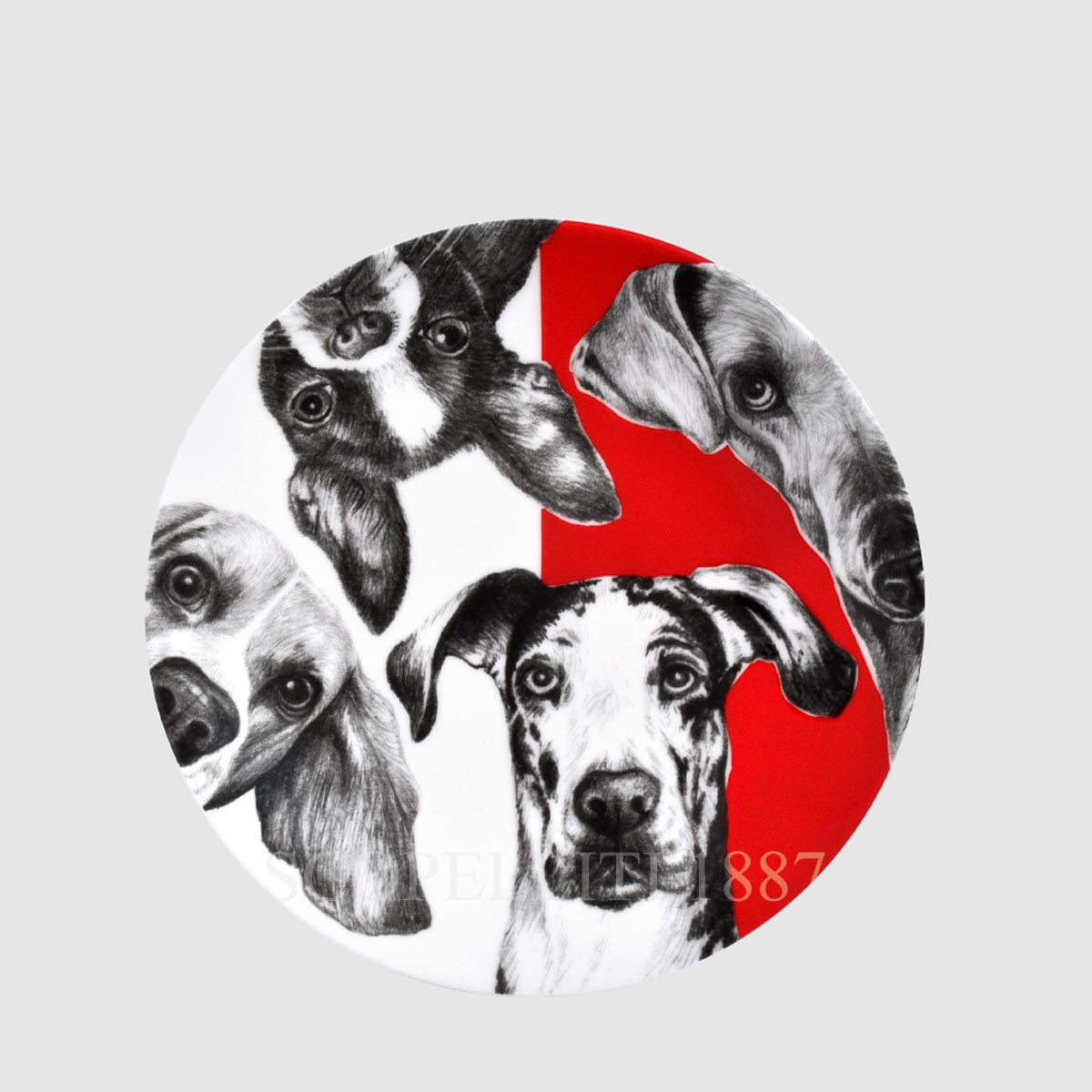 Celebrate the special bond between humans and their loyal companions with the Taitù Best Friends Bread Plate Dogs. Made from fine bone china, this plate features a delightful black-and-white line art illustration of two dogs peeking out from behind a bold red panel. This charming design embodies affection and friendship, making it a perfect gift for animal lovers and those who appreciate thoughtful, playful design.