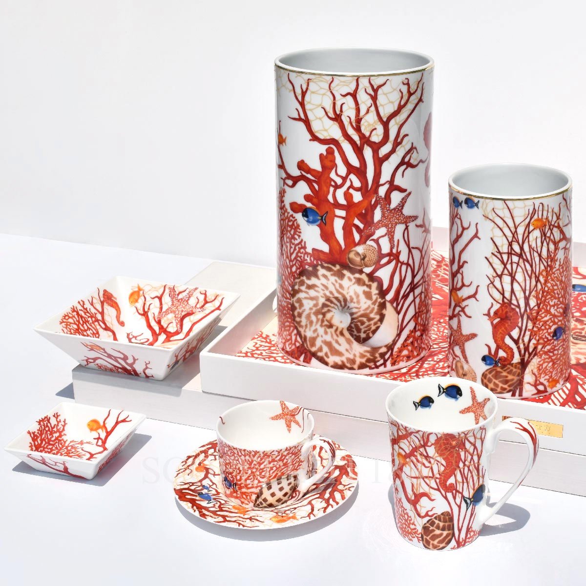 The Mare Collection by Taitù celebrates the beauty of the ocean and its vibrant marine life. From tropical fish to intricate coral reefs, each piece in this collection captures the essence of the sea with remarkable attention to detail. Made from Fine Bone China, the items are both durable and luxurious, making them ideal for elegant table settings or as cherished gifts. Perfect for ocean lovers and collectors of refined tableware, the Mare Collection brings the tranquility and vibrancy of the sea to any home.