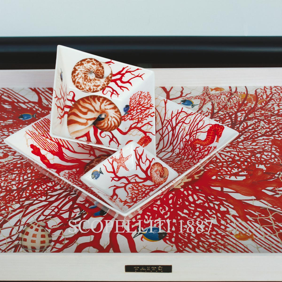 The Mare Collection by Taitù is a stunning tribute to the vibrancy and allure of the ocean. Inspired by the captivating beauty of marine life, the collection features intricate designs of tropical fish, starfish, nautilus, and coral reefs, all brought to life with exceptional craftsmanship. Each piece in the collection is made from Fine Bone China, offering both elegance and durability. Whether as a decorative piece or a functional item, the Mare collection transforms any space, bringing the tranquil yet dynamic energy of the ocean into your home. Perfect for collectors and those who appreciate refined artistry, this collection makes a bold yet graceful statement in any setting.
