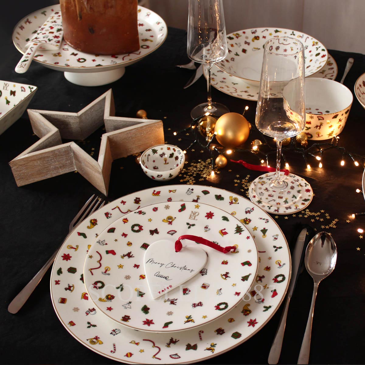 The Noel Oro Collection by Taitù redefines holiday elegance with luxurious gold detailing. Inspired by the enchanting magic of Christmas, this collection features artistic motifs, a luminous white base, and contemporary shapes that elevate seasonal dining. The NOEL logo, along with its delicate embellishments, creates a timeless festive ambiance.