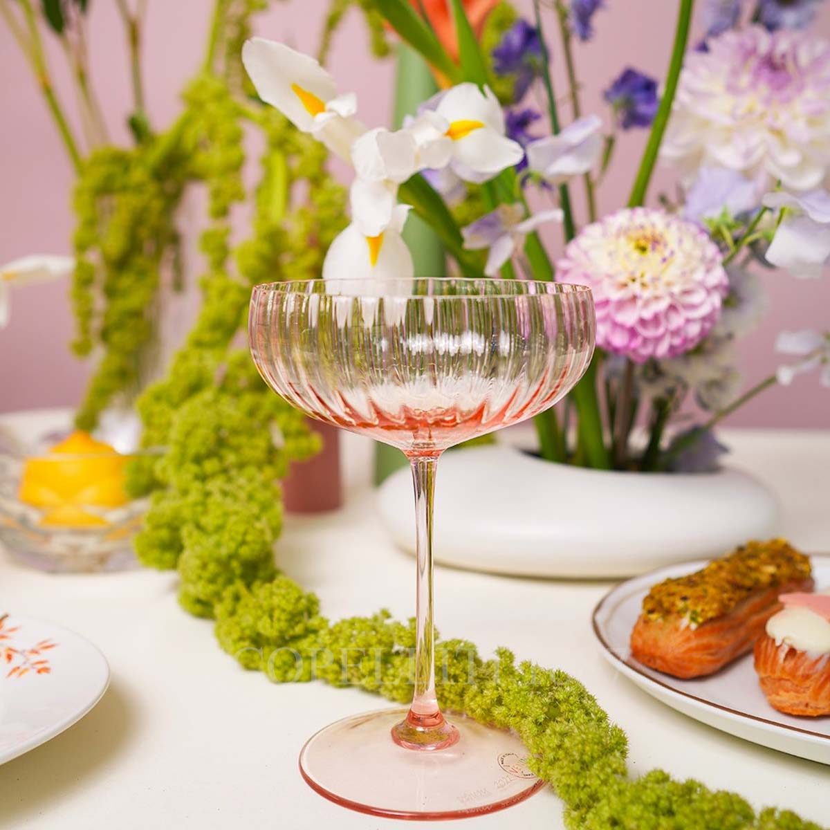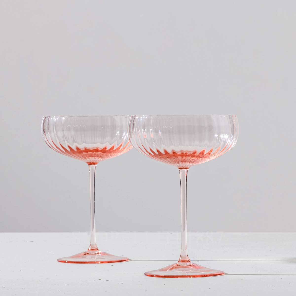 Venini Champagne Glasses Bollicine is a set of two elegant cocktail or champagne coupe glasses with a modern design. The glasses feature a wide, shallow bowl with a subtle rippled texture that adds a decorative detail. They are made from clear glass with a delicate hint of pink at the base and stem, creating a stylish and sophisticated look. The slender stems give them a refined and lightweight feel, perfect for serving cocktails, champagne, or desserts at a special occasion or stylish gathering. Crafted from hand-finished blown glass, the Venini Champagne Glasses Bollicine offers a sophisticated way to toast in style. These elegantly designed champagne goblets are perfect for any occasion, ensuring there’s always a reason to celebrate.