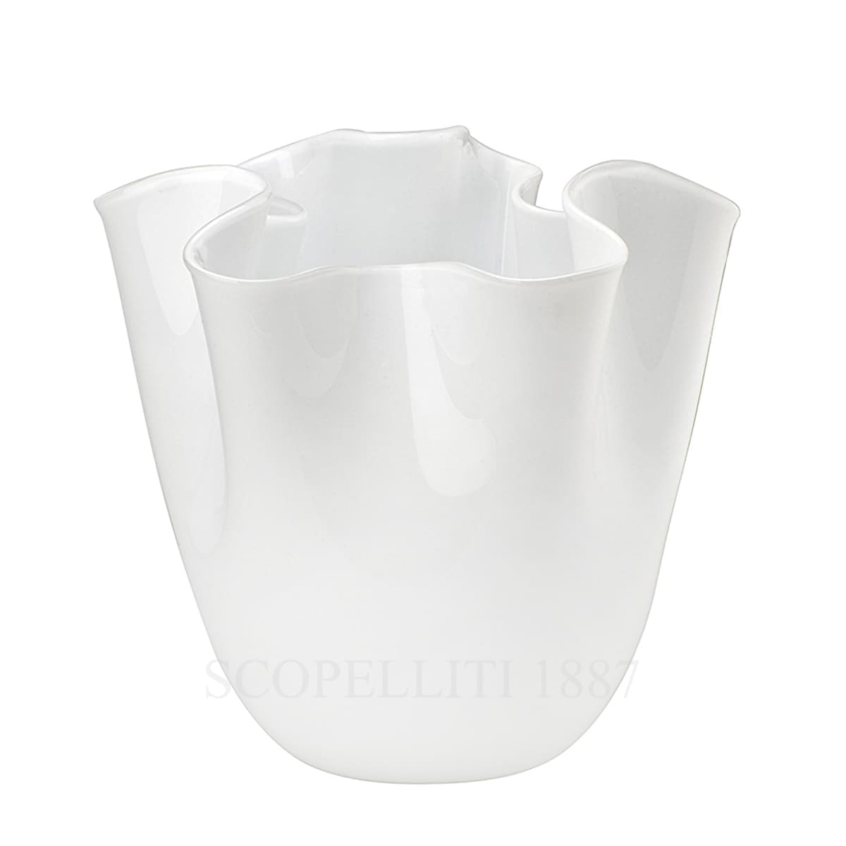 The Venini Fazzoletto Vase Large Milk White is an icon of Venini. For over 50 years it has been featured in museums and art exhibitions. Fazzoletto, handmade and blown, each one is unique. Using a highly suggestive technique, the master glass blower gives the still soft glass the form of an upturned handkerchief. The technical part of Opalino from the manufacture of milk glass, an opaque white glass, invented in Murano in the mid-fifteenth century to imitate the first porcelain all the rage in Europe. It is obtained by superimposing “encasing” the milk glass with a glass or more thin transparent and glass, getting beautiful objects with intense colors and bright.