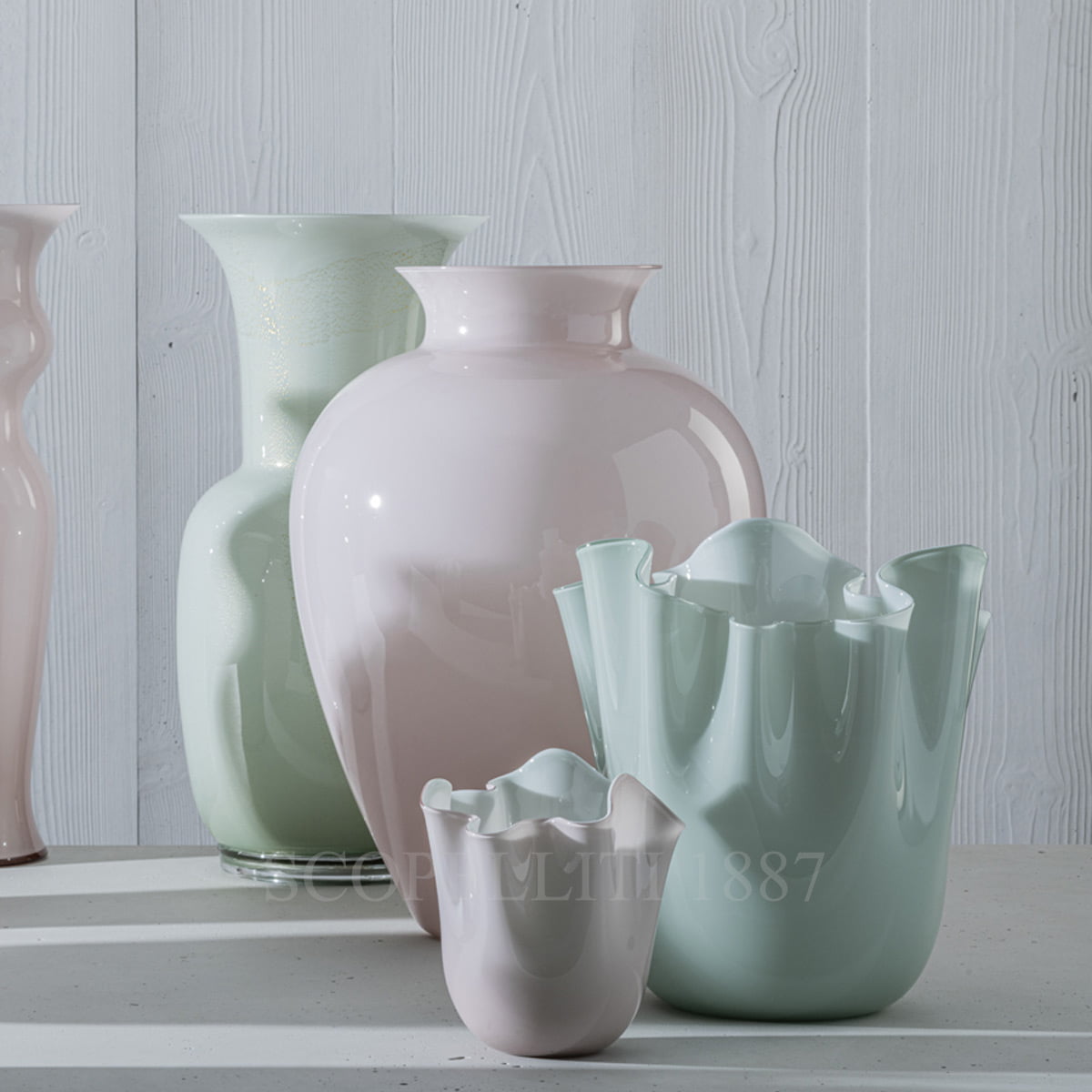 The Venini Fazzoletto Vase Large Rio Green 700.00 is an icon of Venini. For over 50 years it has been featured in museums and art exhibitions. Fazzoletto, handmade and blown, each one is unique. Using a highly suggestive technique, the master glass blower gives the still soft glass the form of an upturned handkerchief. The technical part of Opalino from the manufacture of milk glass, an opaque white glass, invented in Murano in the mid-fifteenth century to imitate the first porcelain all the rage in Europe. It is obtained by superimposing “encasing” the milk glass with a glass or more thin transparent and glass, getting beautiful objects with intense colors and bright.