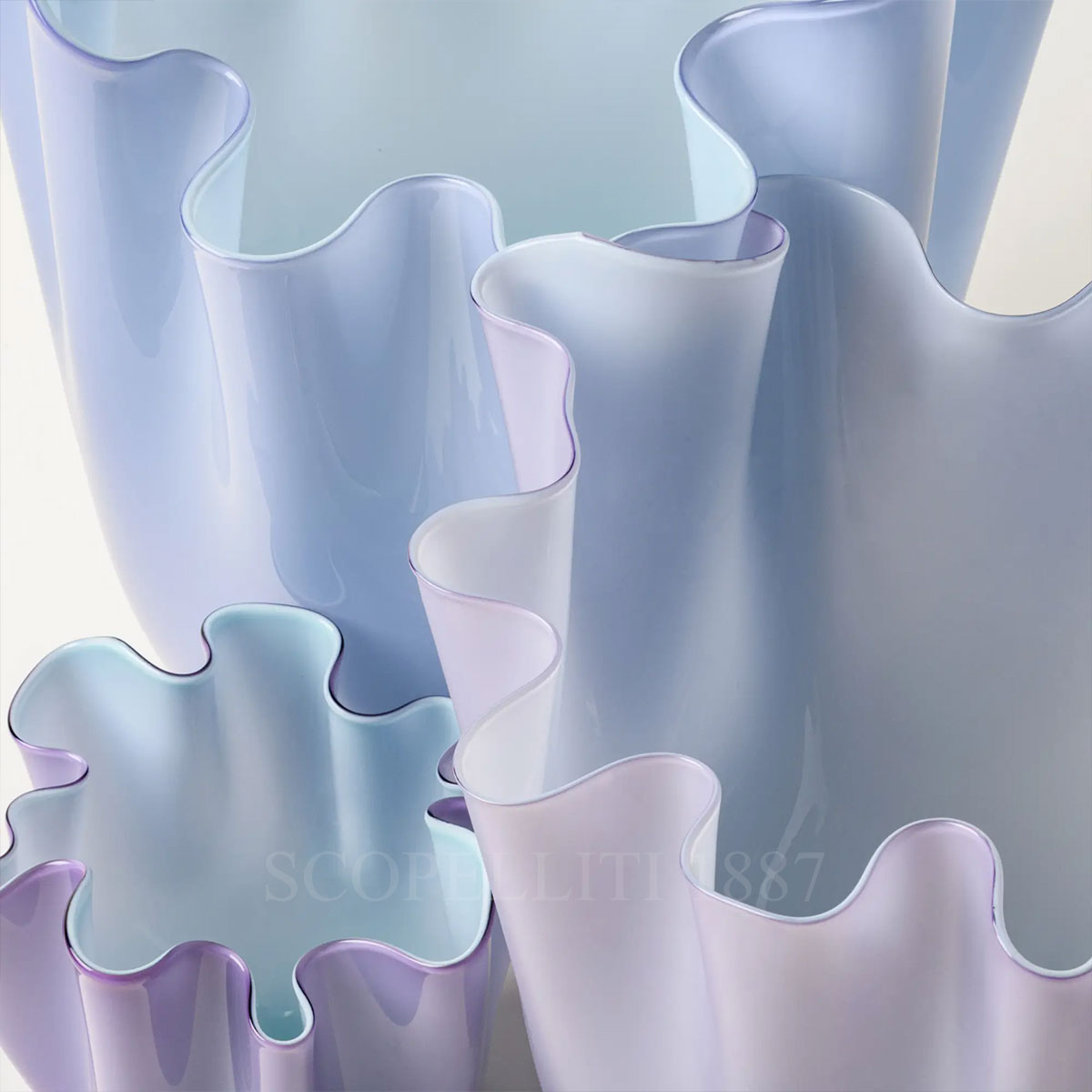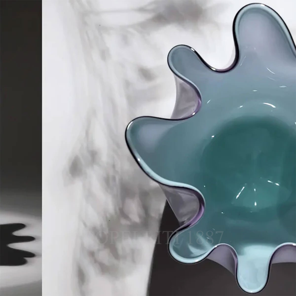 The Venini Fazzoletto Vase Lilac Mint Green Medium transforms the iconic 1948 design into a modern statement piece. Handmade and mouth-blown in Murano, each vase is unique, capturing the delicate, fluid form of an upturned handkerchief. Its dynamic shape and soft, layered hues reflect decades of artistic mastery, making it a collectible piece admired in museums and art exhibitions worldwide.