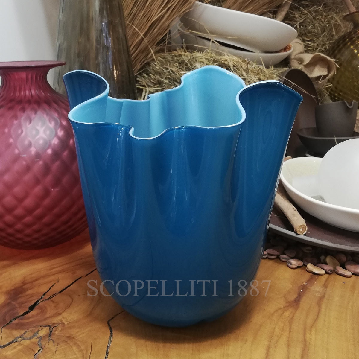 The Venini Fazzoletto Vase Medium Horizon Aquamarine is an icon of Venini. For over 50 years it has been featured in museums and art exhibitions. Fazzoletti, handmade and blown, each one is unique. Using a highly suggestive technique, the master glass blower gives the still soft glass the form of an upturned handkerchief. The technical part of Opalino from the manufacture of milk glass, an opaque white glass, invented in Murano in the mid-fifteenth century to imitate the first porcelain all the rage in Europe. It is obtained by superimposing “encasing” the milk glass with a glass or more thin transparent and d glass, getting beautiful objects with intense colors and bright.