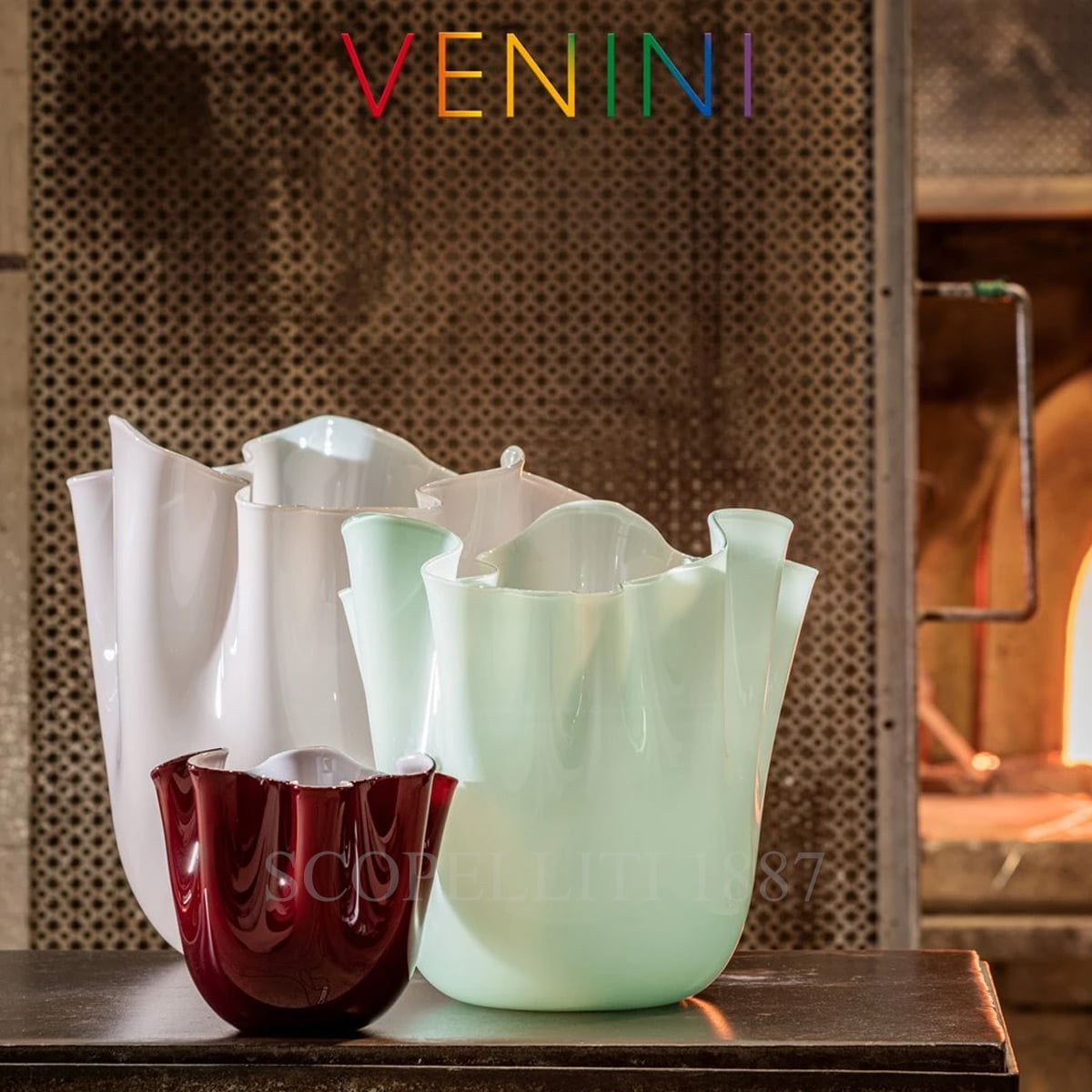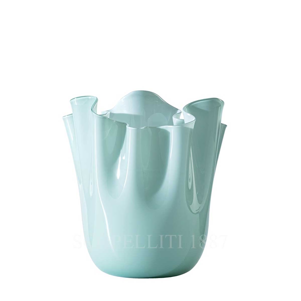 The Venini Fazzoletto Vase Medium Rio Green is an icon of Venini. For over 50 years it has been featured in museums and art exhibitions. Fazzoletto, handmade and blown, each one is unique. Using a highly suggestive technique, the master glass blower gives the still soft glass the form of an upturned handkerchief. The technical part of Opalino from the manufacture of milk glass, an opaque white glass, invented in Murano in the mid-fifteenth century to imitate the first porcelain all the rage in Europe. It is obtained by superimposing “encasing” the milk glass with a glass or more thin transparent and glass, getting beautiful objects with intense colors and bright.