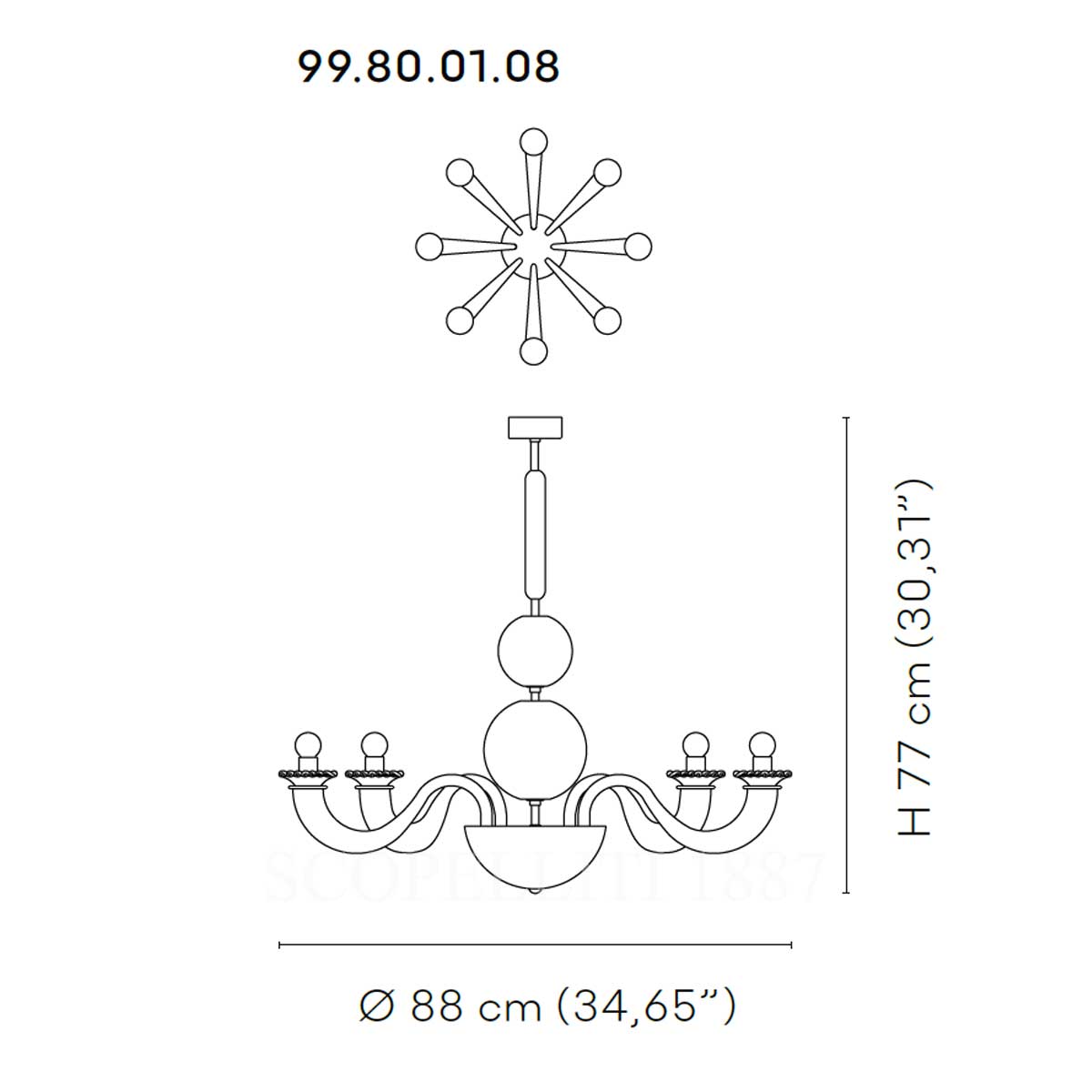 The Venini Gio Ponti 8 Lights Chandelier is a stunning multicolored Murano glass creation designed by Gio Ponti for Venini, a renowned Venetian glassmaker. This specific design, first conceived in 1946, is celebrated for its handblown glass arms and unique multicolor composition, blending functionality with bold aesthetics. The chandelier features 8 lights arranged on gracefully curved glass arms, radiating from a central core that highlights Venini’s exceptional craftsmanship in Murano glass techniques. The piece is mounted on a golden metal frame with a chain for suspension. Its dimensions are approximately 88 cm in diameter and 77 cm in height, making it a statement lighting fixture suitable for modern or eclectic interiors. This design is a timeless example of Ponti’s innovative approach to merging traditional Italian glass artistry with contemporary design principles, reflecting the vibrant energy of post-war Italian modernism
