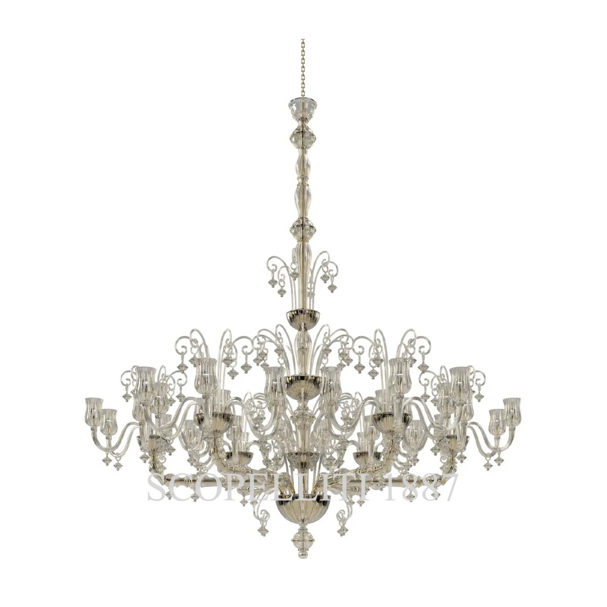 The Venini Marcello Chandelier is a true masterpiece, adorned with a stunning array of curls, pendants, and hand-blown glass cups, each meticulously crafted to create an opulent display. This chandelier is further enhanced by the luxurious addition of gold leaf, which adds a touch of brilliance and warmth to its design. With its impressive dimensions, the Venini Marcello Chandelier stands out for its unique horizontal structure, offering a striking silhouette that contrasts with traditional vertical forms. The Venini Marcello Chandelier is an ideal choice for sophisticated interiors, bringing a refined, stately elegance that enriches any space. Its intricate details and bold, expansive design make the Venini Marcello Chandelier not just a light fixture but a statement piece, perfectly suited for grand rooms or refined environments seeking a touch of Italian artistry and luxury.