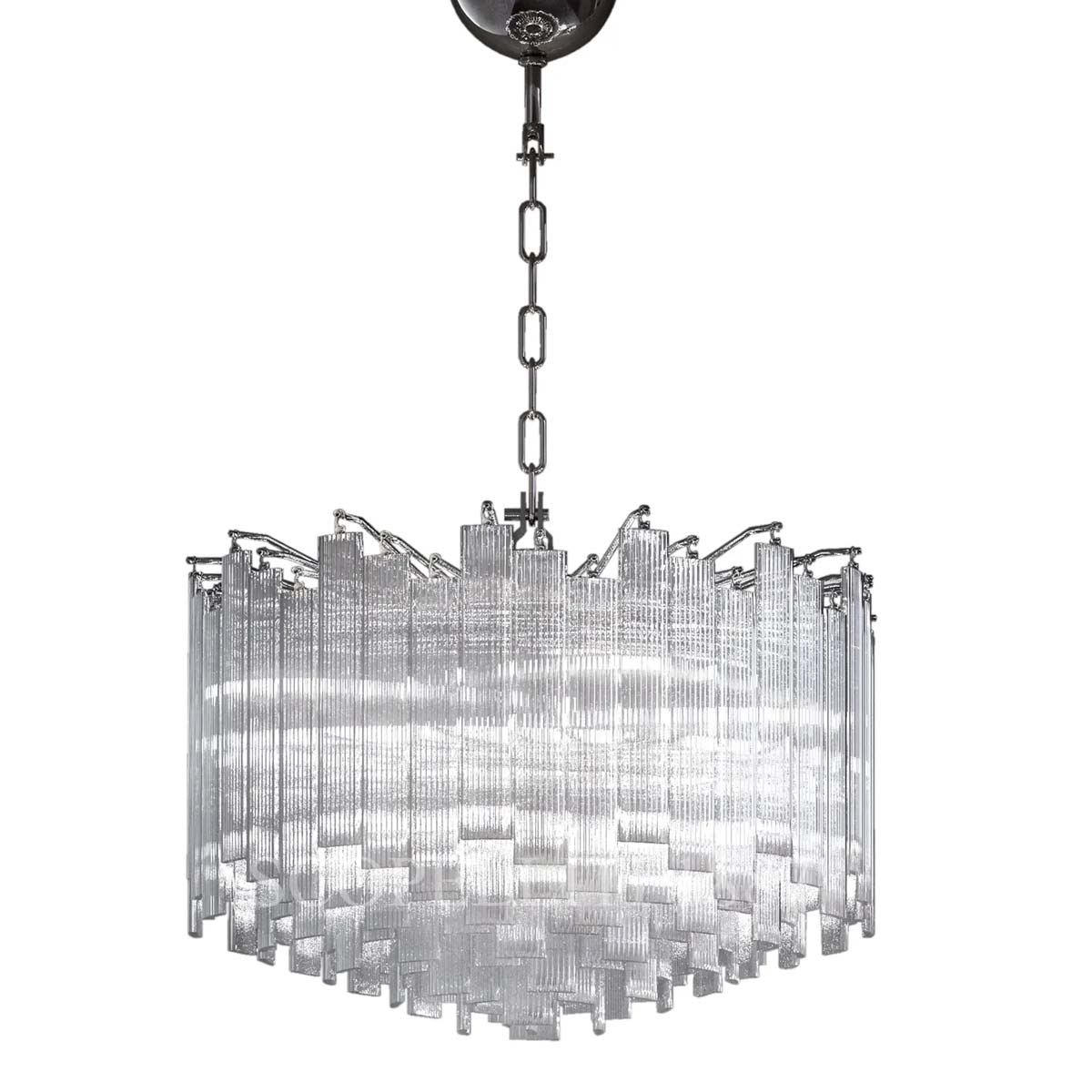 The Venini Nastri Chandelier 920.52 is composed of handcrafted crystal glass “Nastro” elements suspended from a chromium-plated metal structure with a chain. The delicate Rigadin technique imparts a textured elegance to each glass piece, creating a harmonious blend of tradition and modernity. This chandelier’s refined design and quality craftsmanship make it a striking centerpiece for any sophisticated interior. Part of Venini’s Modular series, the chandelier is available in other sizes; please contact us for further information.