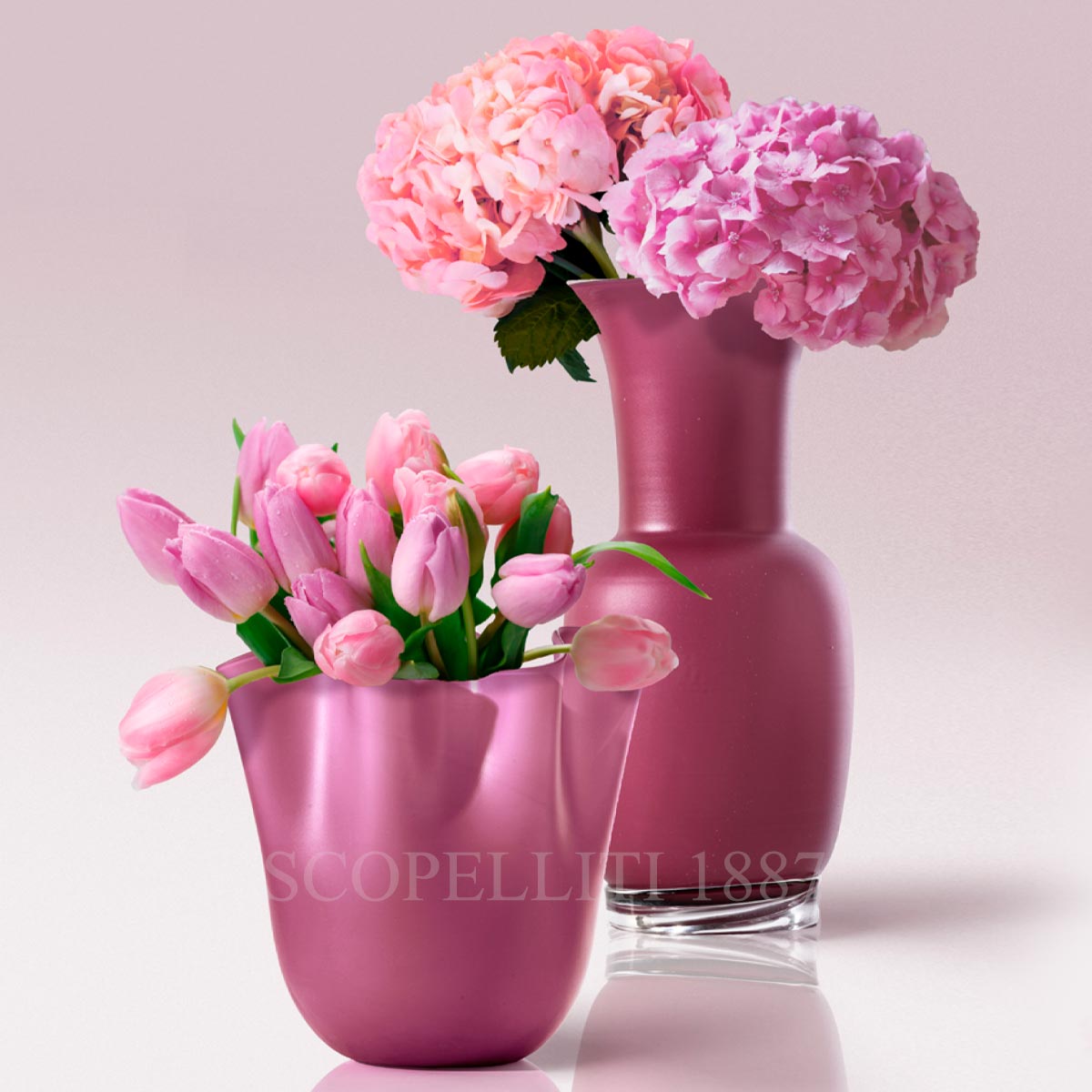 The Venini Opalino Vase Magenta Sandblasted Medium is a stunning piece of Murano glass craftsmanship, known for its striking, vivid colors and pure, essential lines. Handmade and blown by expert artisans, this vase features an exquisite amber hue that radiates elegance and sophistication. The design, originally created by Venini in 1932, is part of the iconic Opalino collection, which showcases the timeless beauty of opaline glass. Opaline glass, also known as lattimo, was first developed in Murano around the mid-15th century in an attempt to imitate porcelain. By the 1930s, this unique opaque glass was elevated to an art form, and the Opalino collection reflects its golden age. The Opalino technique involves encasing lattimo glass in thin layers of transparent or colored glass, resulting in a luminous, colorful effect that is both captivating and elegant.
