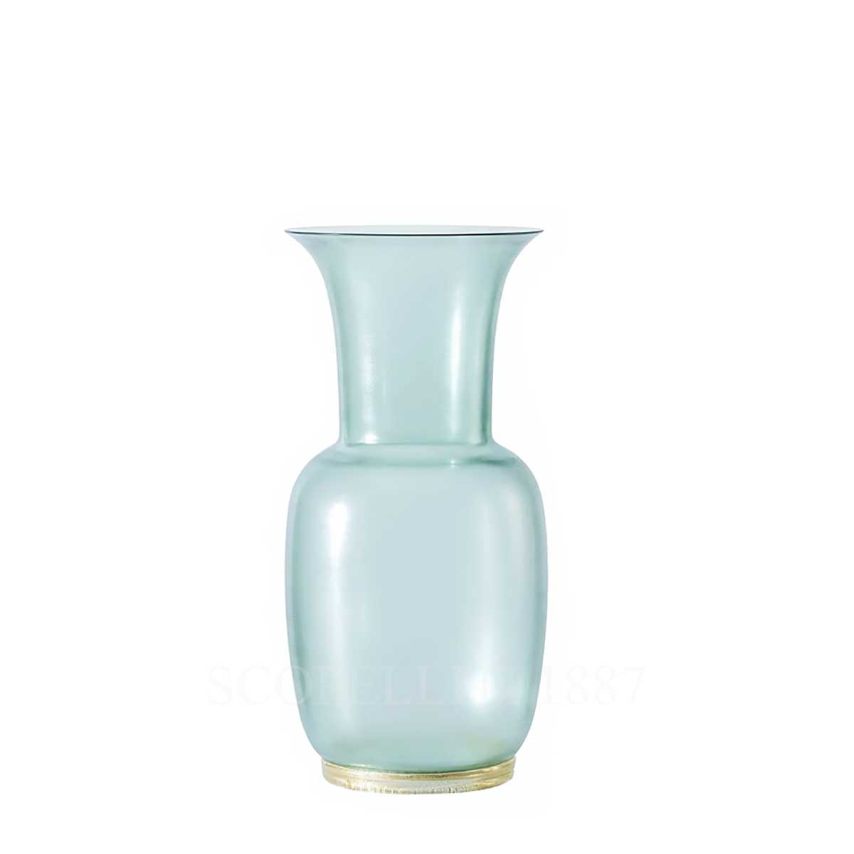 This Venini Opalino Vase Satin Medium Rio Green is a magnificient vase made with the usage of special processing cold technique called Satin that characterizes the texture of its surface . The clear, almost transparent handblown coloured glass is decorated at the base by a sword-shaped foot, applied hot free-hand with the addition of majestic gold leaf. The Venini Opalino Vase Satin Medium Rio Green is a stunning piece of Murano glass craftsmanship, known for its striking, vivid colors and pure, essential lines. Handmade and blown by expert artisans, this vase features an exquisite amber hue that radiates elegance and sophistication. The design, originally created by Venini in 1932, is part of the iconic Opalino collection, which showcases the timeless beauty of opaline glass. Opaline glass, also known as lattimo, was first developed in Murano around the mid-15th century in an attempt to imitate porcelain. By the 1930s, this unique opaque glass was elevated to an art form, and the Opalino collection reflects its golden age. The Opalino technique involves encasing lattimo glass in thin layers of transparent or colored glass, resulting in a luminous, colorful effect that is both captivating and elegant.