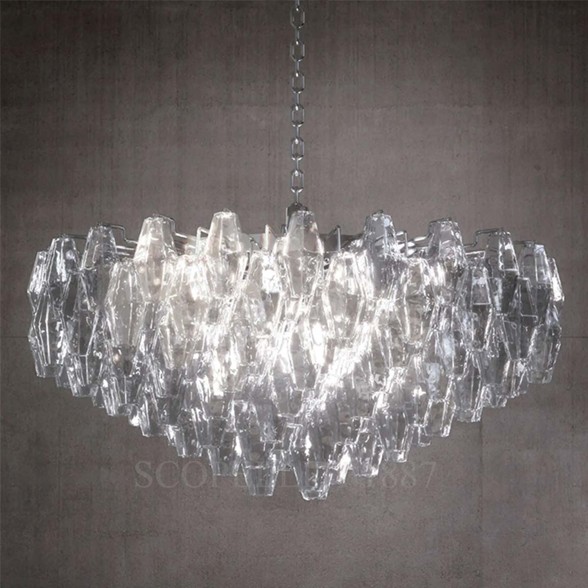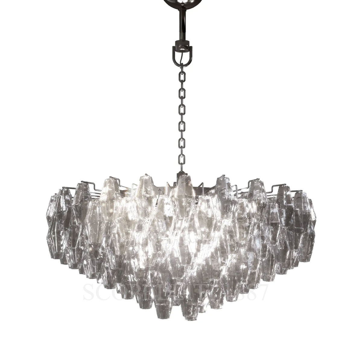 The Venini Poliedri Chandelier 951.34 is an iconic spherical chandelier composed of multiple handblown crystal glass Poliedri elements arranged in layers. Originally introduced for the great Venini chandelier designed by Ignazio Gardella, Paolo Venini, and Enrico Peresutti, it was showcased at the 1958 Brussels Expo in the central hall of the Italian Pavilion. This modular design was also the basis for the famous cascading chandelier presented by Venini and Carlo Scarpa at the 1961 Turin Expo “Italia ‘61”. The Poliedri glass elements enable the creation of lighting fixtures in ever-changing forms and sizes. The substantial suspension’s structure is crafted from chromium-plated metal, combining Venetian glass artistry with modern elegance. Part of Venini’s Modular series, the chandelier is available in other sizes; please contact us for further information.