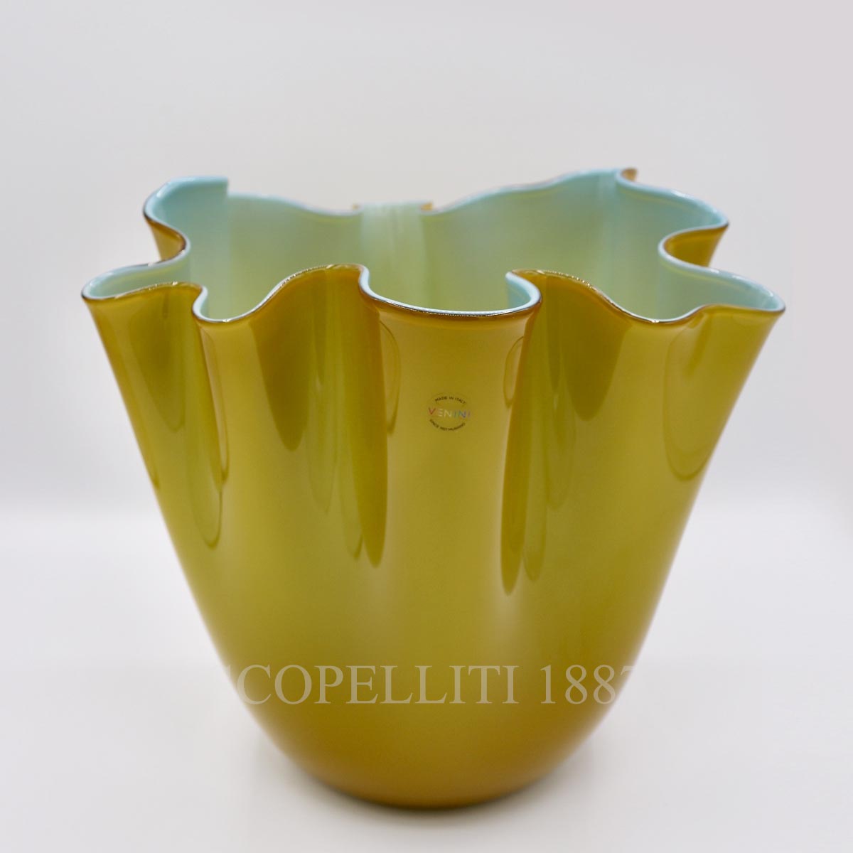 The Venini Unique Fazzoletto Vase Medium is an icon of Venini. For over 50 years it has been featured in museums and art exhibitions. Fazzoletto, handmade and blown, each one is unique. Using a highly suggestive technique, the master glass blower gives the still soft glass the form of an upturned handkerchief. The technical part of Opalino from the manufacture of milk glass, an opaque white glass, invented in Murano in the mid-fifteenth century to imitate the first porcelain all the rage in Europe. It is obtained by superimposing “encasing” the milk glass with a glass or more thin transparent and glass, getting beautiful objects with intense colors and bright.